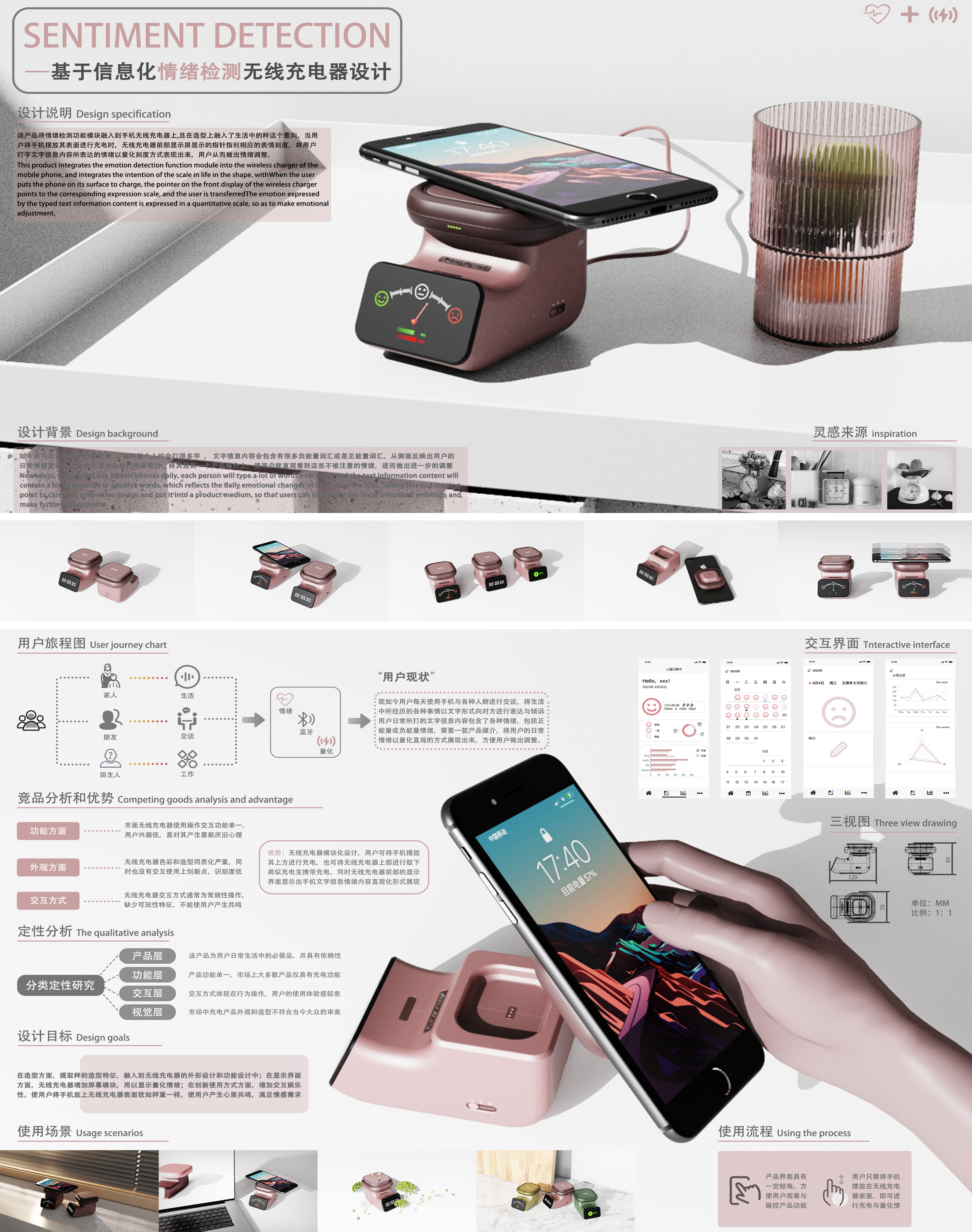 该产品将情绪检测功能模块融入到手机无线充电器上,且在造型上融入了生活中的秤这个意向。当用户将手机摆放其表面进行充电时,无线充电器前部显示屏显示的指针指到相应的表情刻度,将用户打字文字信息内容所表达的情绪以量化刻度方式表现出来,用户从而做出情绪调整。