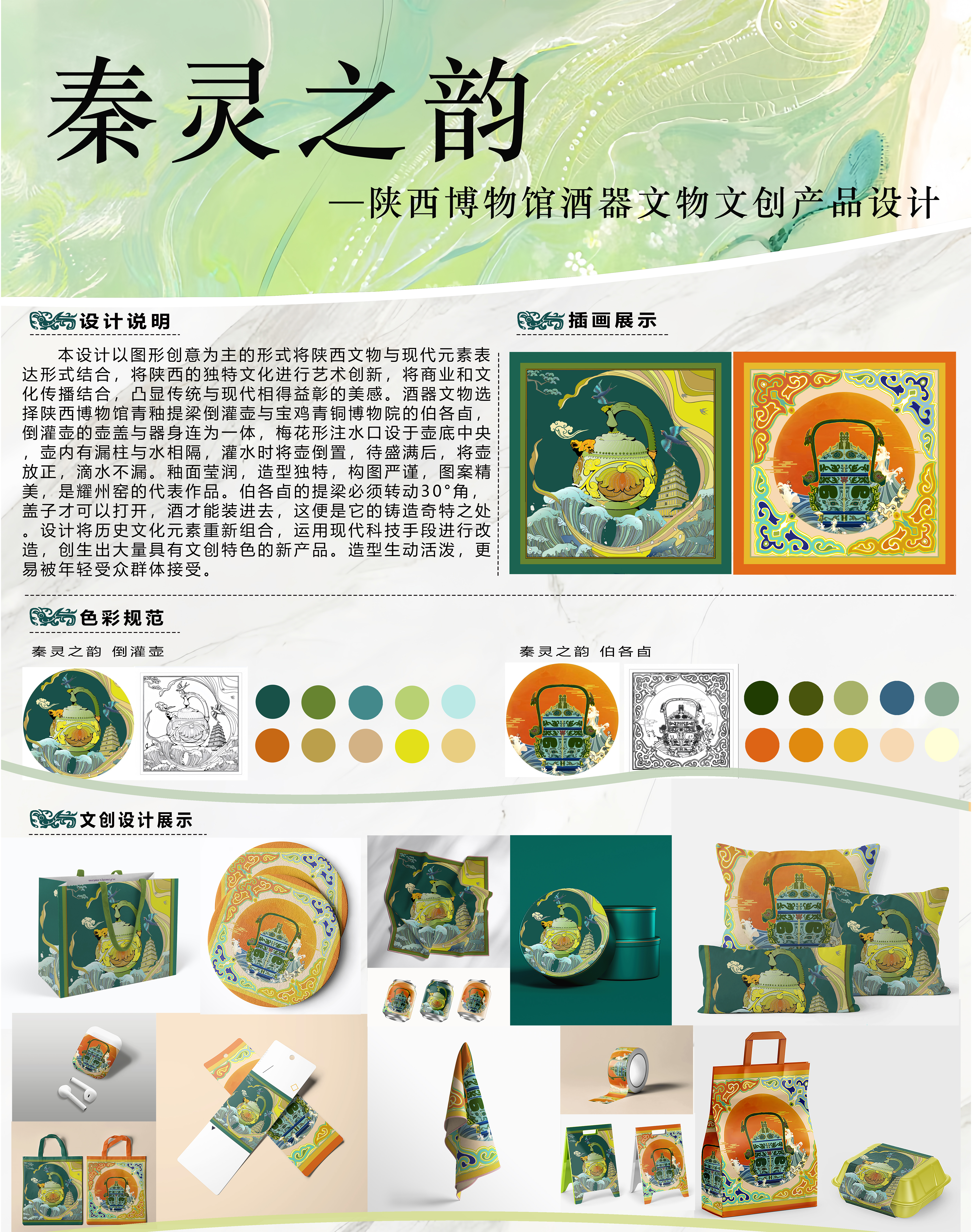 本设计以图形创意为主的形式将陕西文物与现代元素表达形式结合,将陕西的独特文化进行艺术创新,将商业和文化传播结合,凸显传统与现代相得益彰的美感。酒器文物选择陕西博物馆青秞提梁倒灌壶与宝鸡青铜博物院的伯各卣。设计将历史文化元素重新组合,运用现代科技手段进行改造,创生出大量具有文创特色的新产品,造型生动活泼,更易被年轻受众群体接受。
