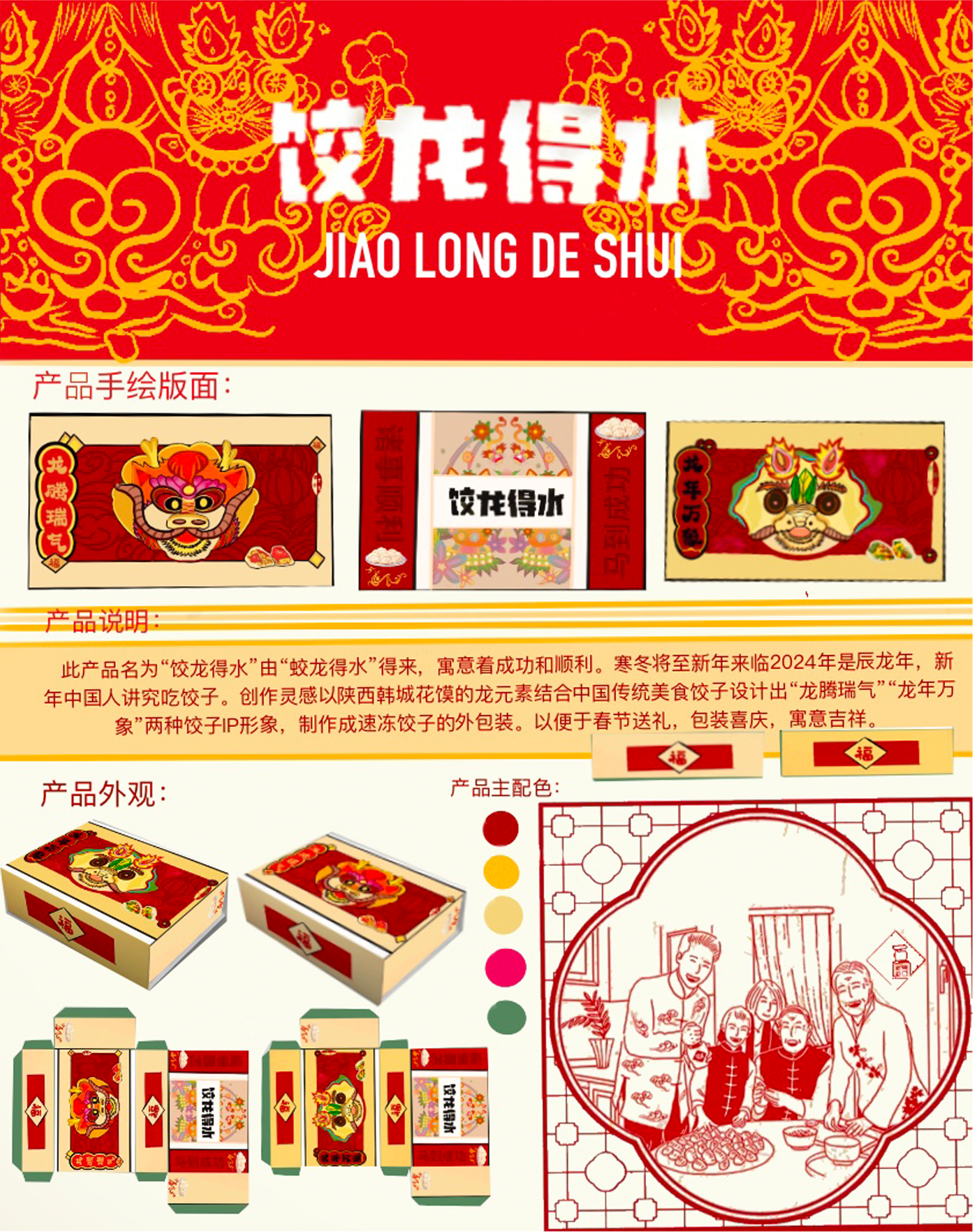 此产品名为“饺龙得水”由“蛟龙得水”得来,寓意着成功和顺利,有抵御困难战胜一切的能力。寒冬将至新年来临2024年是辰龙年,新年中国人讲究吃饺子。创作灵感以陕西韩城花馍的龙元素结合中国传统美食饺子设计出“龙腾瑞气”“龙年万象”两种饺子IP形象,制作成速冻饺子的外包装,同时有“西红柿鸡蛋”“韭菜鸡蛋”两种口味极其配色。以便于春节送礼,包装喜庆,寓意吉祥。