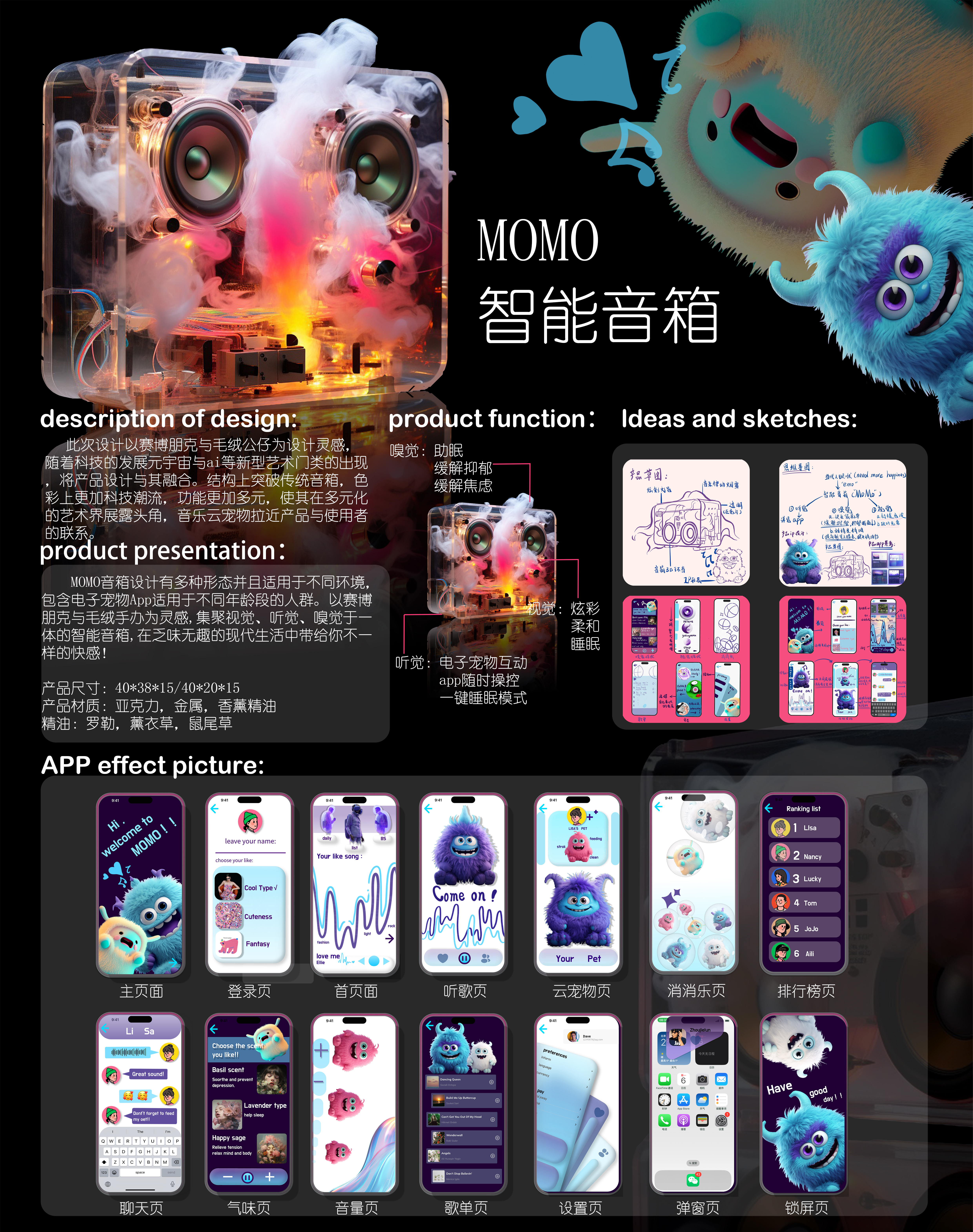 此次设计以赛博朋克与毛绒公仔为设计灵感,随着科技的发展元宇宙与ai等新型艺术门类的出现,将产品设计与其融合。结构上突破传统音箱,色彩上更加科技潮流。MOMO音箱设计有多种形态并且适用于不同环境, 包含电子宠物App适用于不同年龄段的人群,集聚视听嗅于一体的智能音箱,在乏味无趣的现代生活中带给你不一样的快感! 产品尺寸:40*38*15 产品材质:亚克力,金属,香薰精油 精油:罗勒,薰衣草,鼠尾草