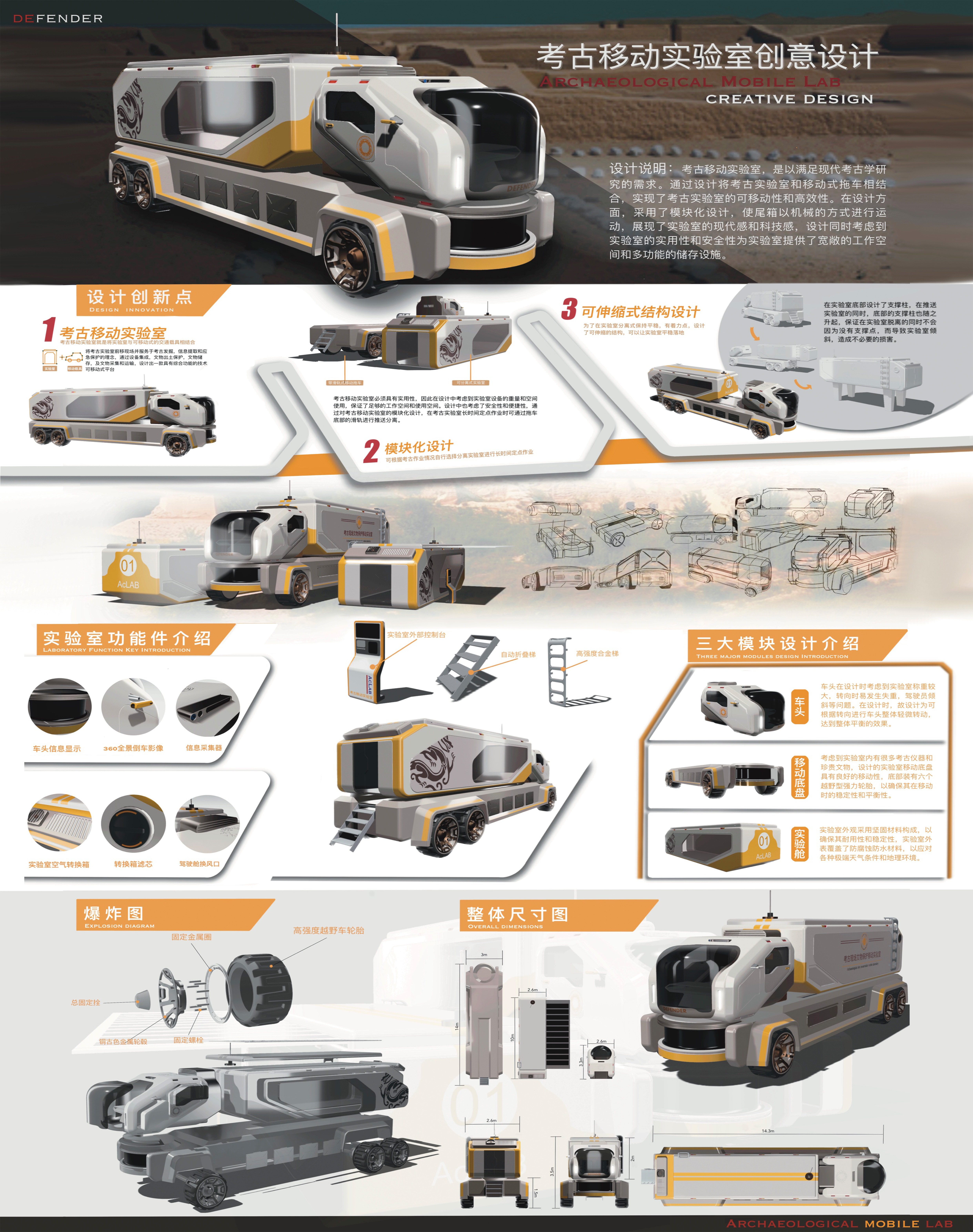 考古移动实验室,是以满足现代考古学研究的需求。通过设计将考古实验室和移动式拖车相结合.实现了考古实验室的可移动性和高效性。在设计方面,采用了模块化设计,使尾箱以机械的方式进行运动,展现了实验室的现代感和科技感,设计同时考虑到实验室的实用性和安全性为实验室提供了宽敞的工作空间和多功能的储存设施。