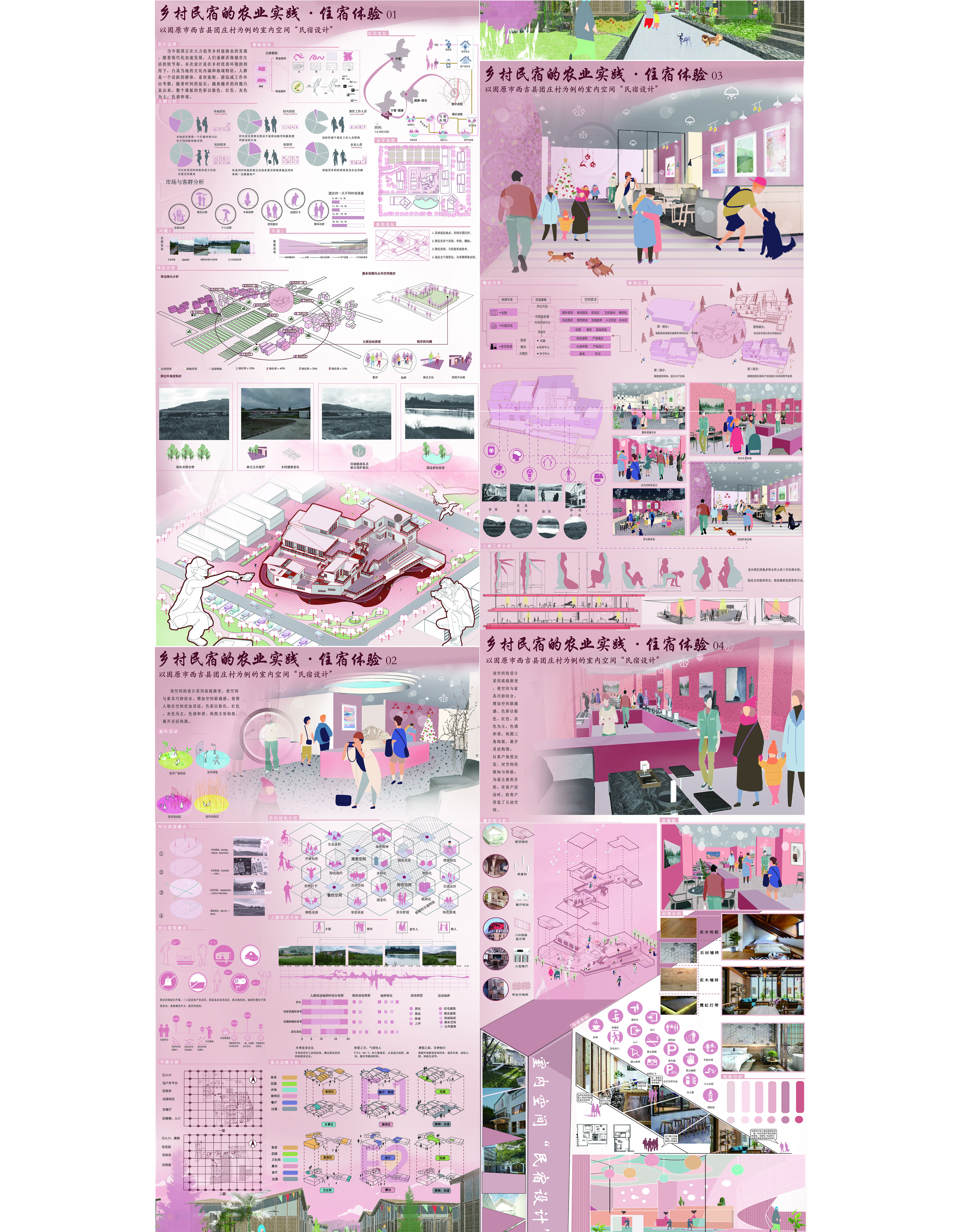当今我国正在大力保导乡村旅游业的发展,随着现代化加速发展,人们逐渐厌侨城市生活的快节奏。本次设计是在乡村优美环境的利用下,凸显当地的文化内涵和地域特征。人群是一个活跃的群体,喜欢逛街,游玩或工作外出考察,随着时间的延长,越来越多的问题凸显出来。整个展板的色彩以粉色、红色、灰色为主,色调和谐。