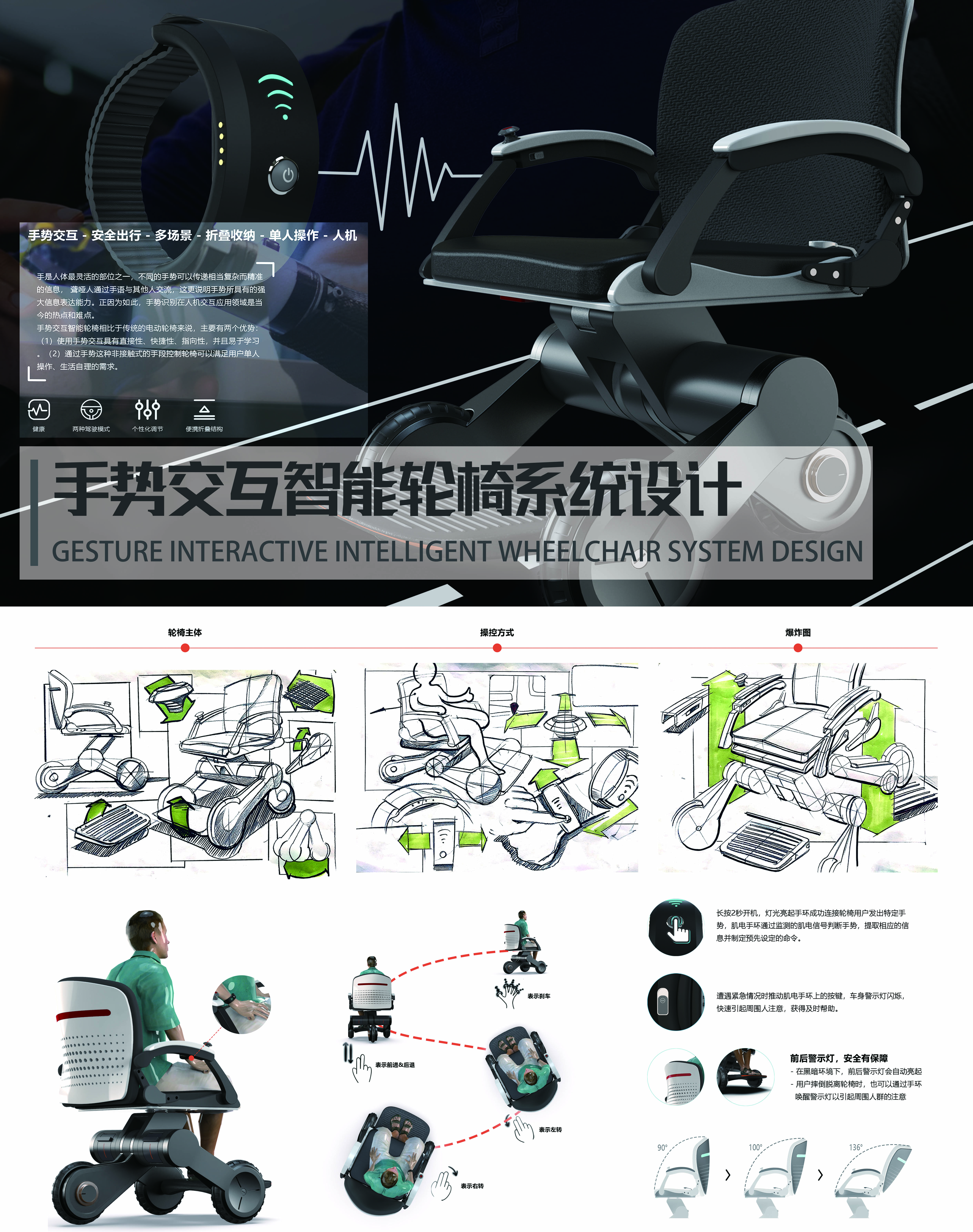 本产品是基于可穿戴肌电信号手势交互控制系统进行的智能轮椅设计。主要分为两个部分:电动轮椅与肌电手环,佩戴在手臂上的肌电手环,能够采集和处理EMG信号进行实时手势识别,让用户通过手势完成控制轮椅的一系列指令。该产品符合人机工学要求,以及支持动态调节的座椅结构,既可以支持不同的使用场景,同时也保证了用户长期使用的安全与健康。