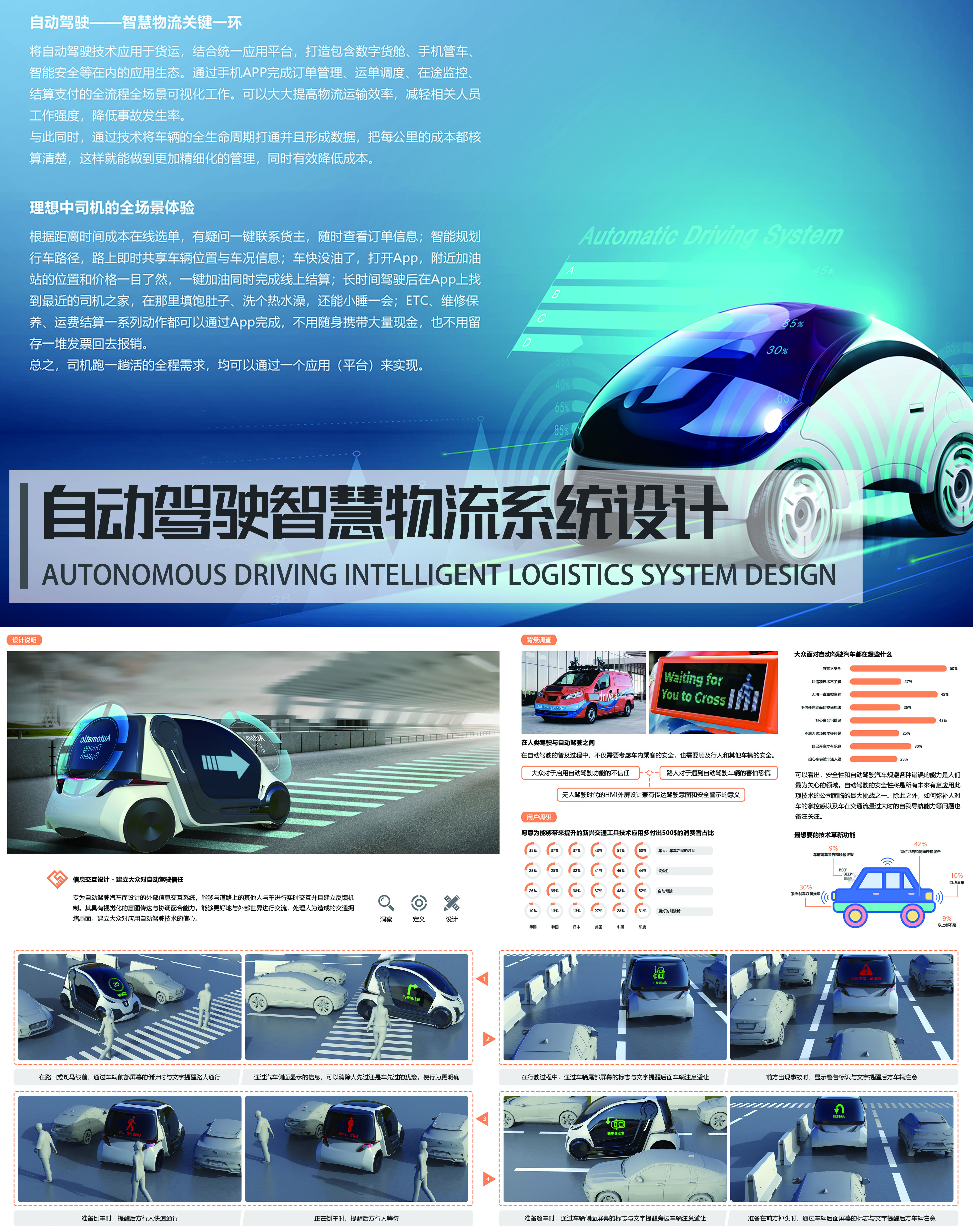 本设计是聚焦于物流中的关键一环——货物运输,以及人车交互的界面与信息传达设计。旨在解决传统货运中存在的效率低下、成本过高等问题,以及探索自动驾驶的应用形式,打消大众对自动驾驶车辆的安全顾虑。此外,本自动驾驶汽车设计的外部信息交互系统,能够与道路上的其他人与车进行实时交互,并且建立反馈机制,具有视觉化的意图传达与协调配合能力,建立大众对应用自动驾驶技术的信心。