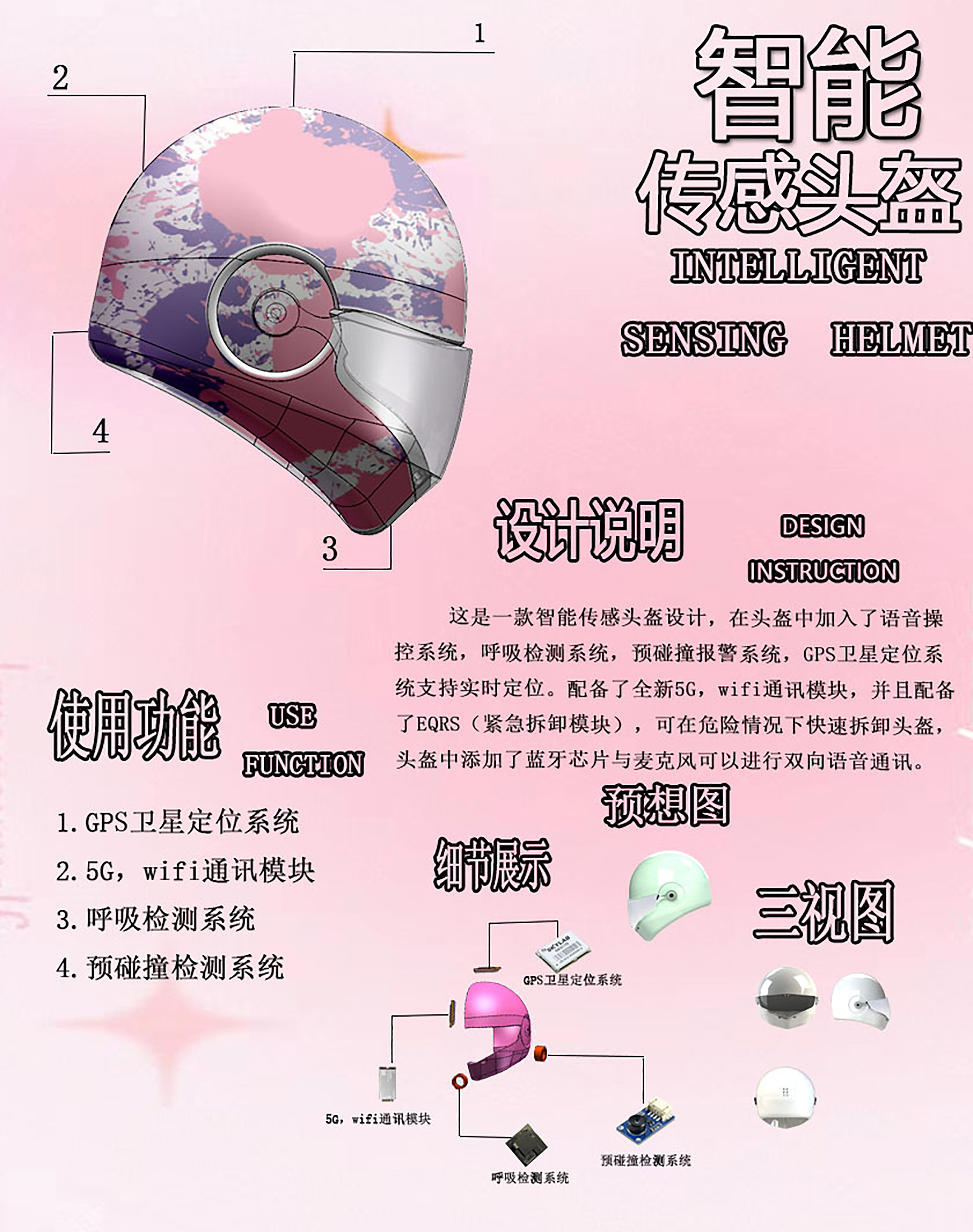 这是一款智能传感头盔设计,与传统机车头盔相比,在头盔中加入了心率检测系统,预碰撞报警系统,GPS卫星定位系统,且支持实时定位。为进一步提升安全性能,我们加入了全新5G通讯模块,并且配备了EQRS紧急拆卸模块(可在危险情况下快速拆卸头盔)科技改变生活,创新造福人类。智能传感头盔为安全而生。