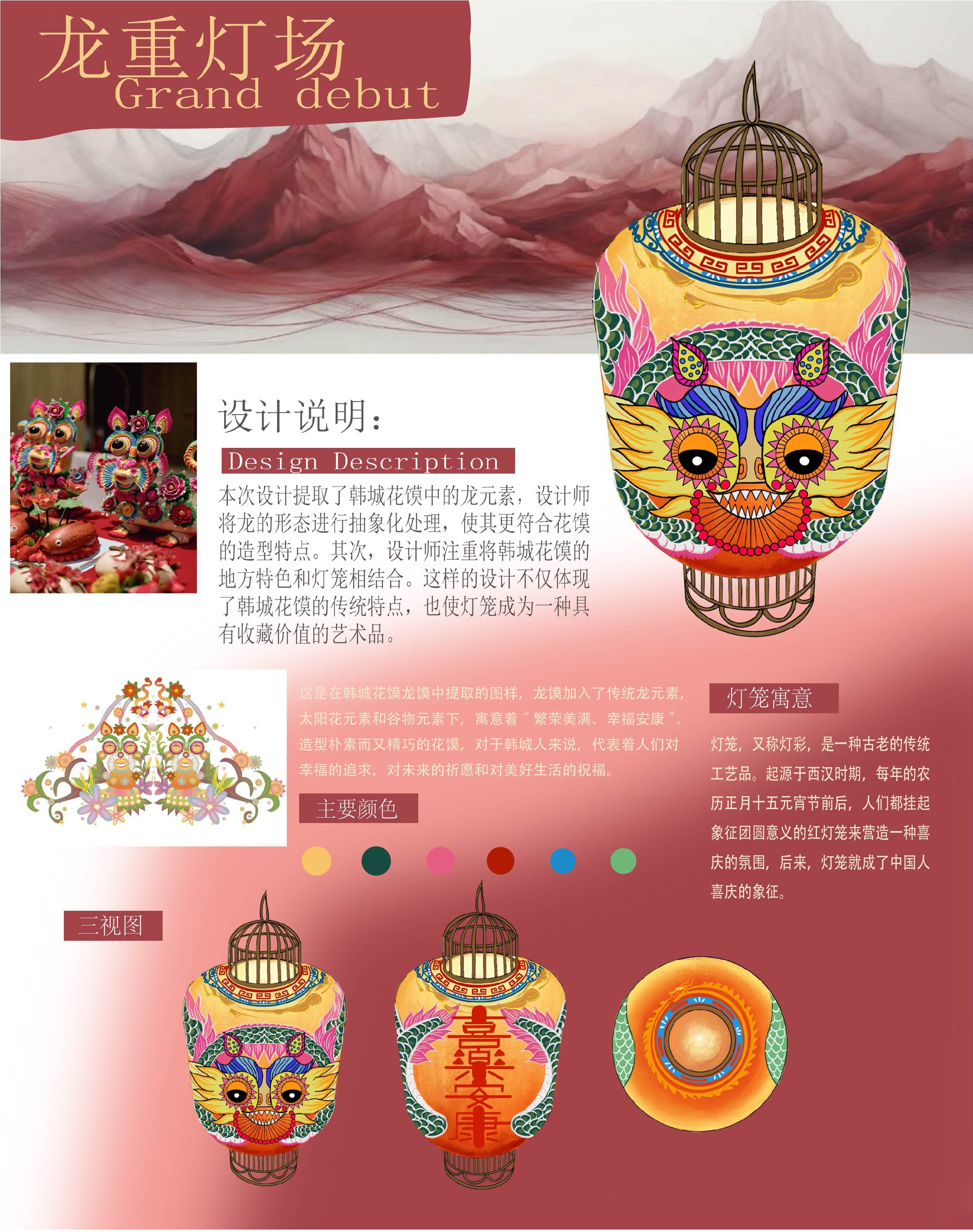 本次设计提取了韩城花馍中的龙元素,设计师将龙的形态进行抽象化处理,使其更符合花馍的造型特点。其次,设计师注重将韩城花馍的地方特色和灯 笼相结合。这样的设计不仅体现了韩城花馍的传统特点,也使灯笼成为一种具有收藏价值的艺术品。