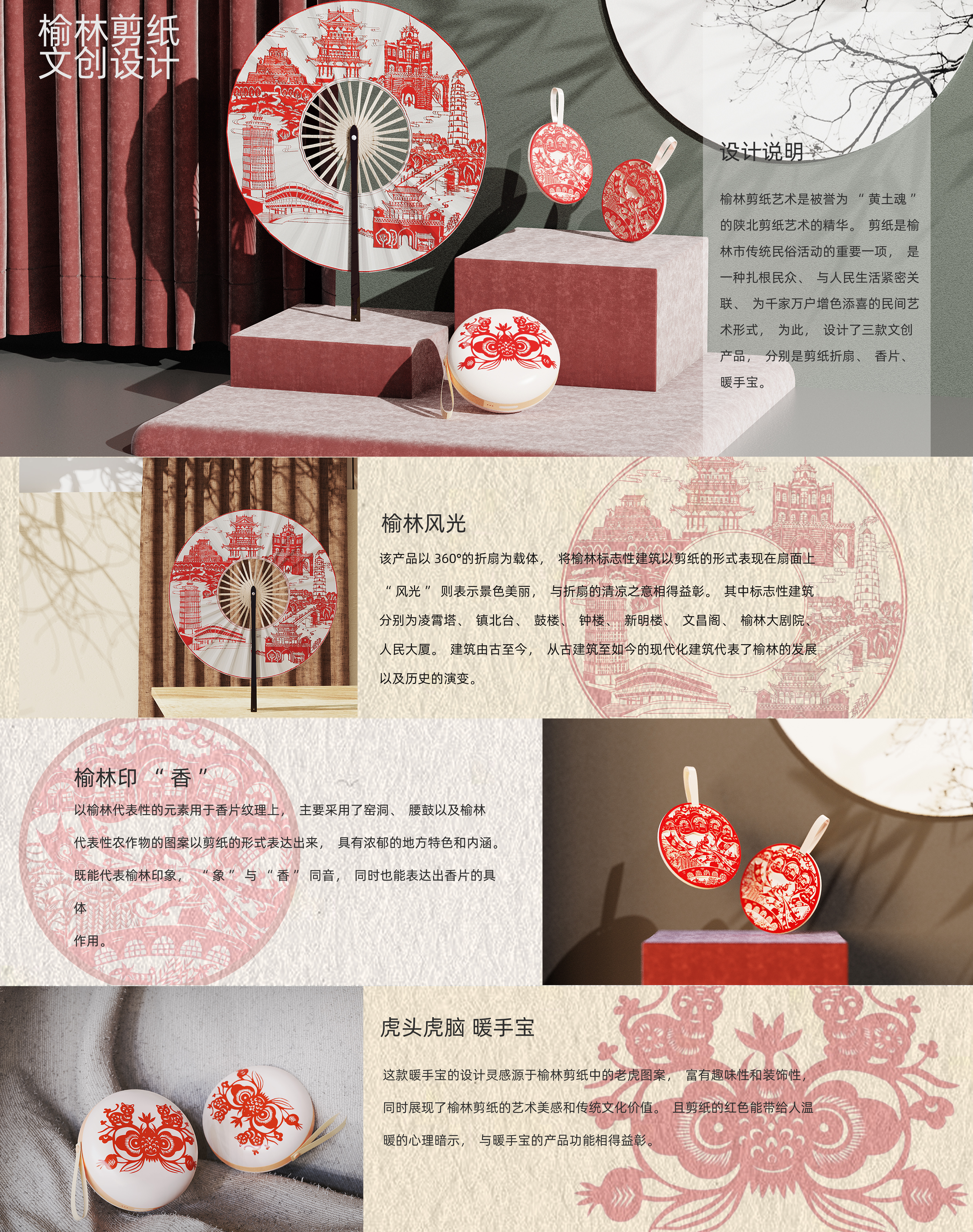 榆林剪纸艺术是被誉为“黄土魂”的陕北剪纸艺术的精华。剪纸是榆林市传统民俗活动的重要一项,是一种扎根民众、与人民生活紧密关联、为千家万户增色添喜的民间艺 术形式,为此,设计了三款文创产品,分别是剪纸折扇、香片、暖手宝。