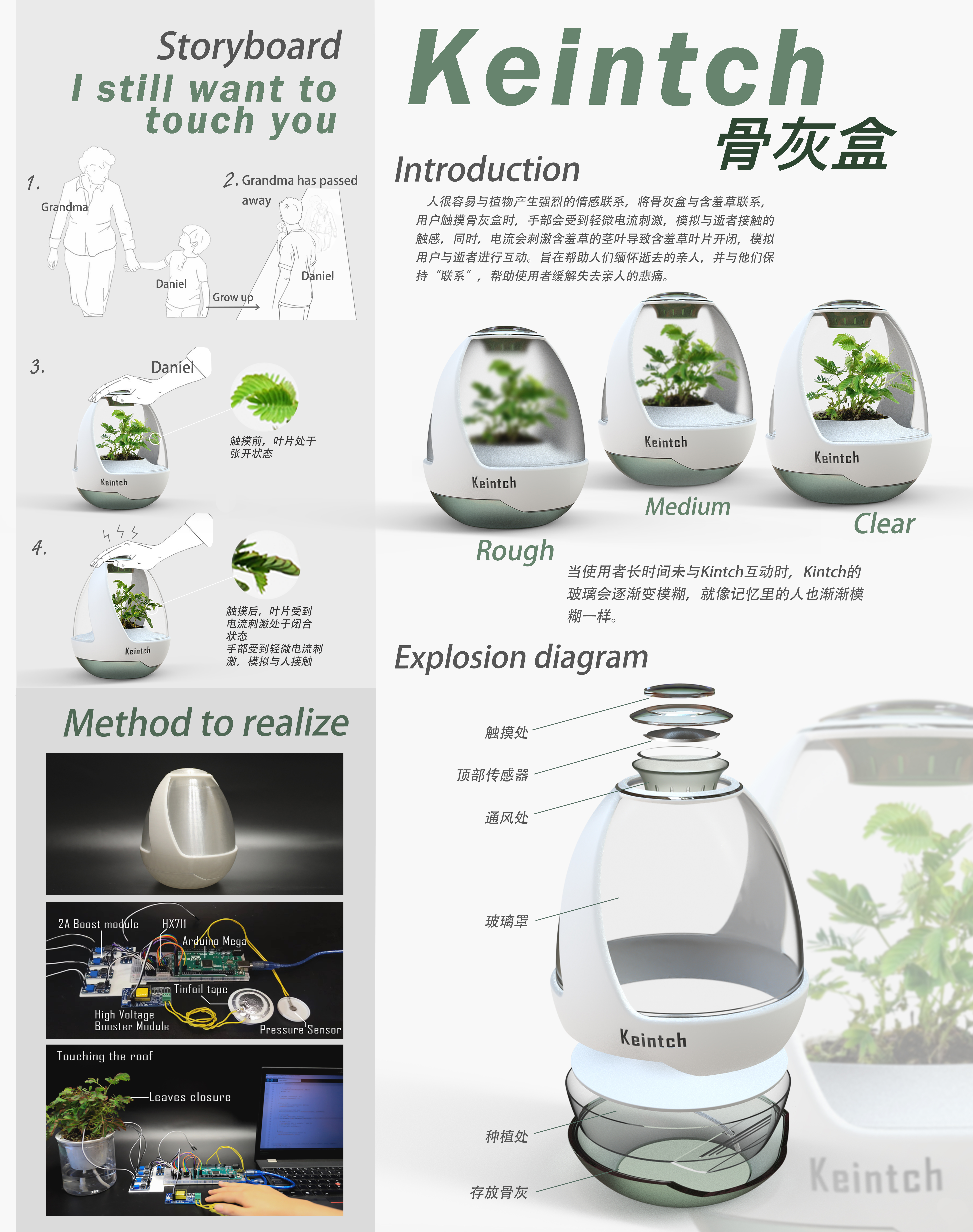 人很容易与植物产生强烈的情感联系,将骨灰盒与含羞草联系,用户触摸骨灰盒时手部会受到轻微电流刺激,模拟与逝者接触的触感。同时,电流会刺激含羞草的茎叶导致含羞叶片开闭,模拟用户与逝者进行互动。旨在帮助人们缅怀逝去的亲人,并与他们保持“联系”,帮助用户缓解失去亲人的悲痛。