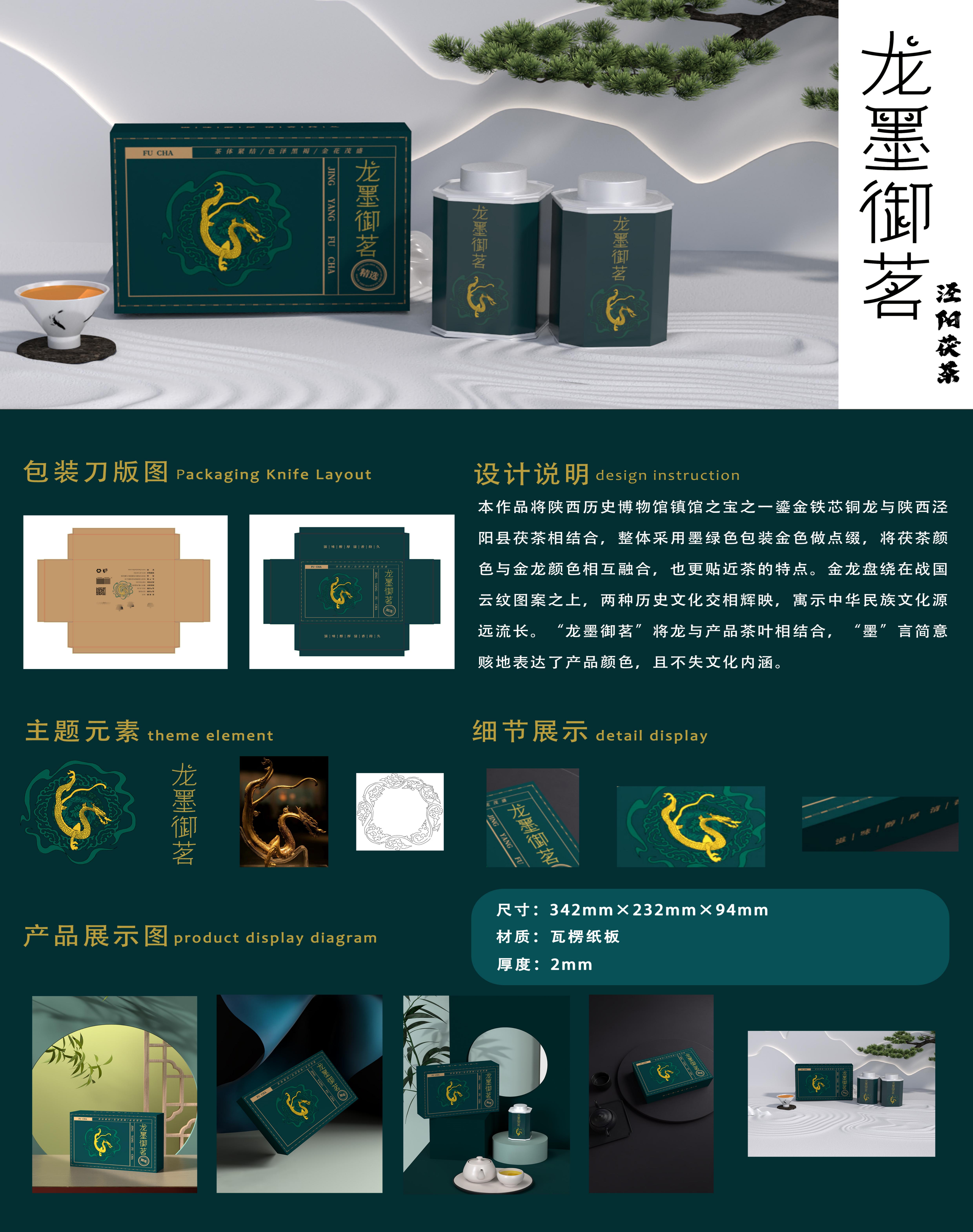 本作品将陕西历史博物馆镇馆之宝之一鎏金铁芯铜龙与陕西泾阳县茯茶相结合,整体采用墨绿色包装金色做点缀,将茯茶颜色与金龙颜色相互融合,也更贴近茶的特点。金龙盘绕在战国云纹图案之上,两种历史文化交相辉映,寓示中华民族文化源远流长。“龙墨御茗”将龙与产品茶叶相结合,“墨”言简意赅的表达了茶的颜色,且不失文化内涵。