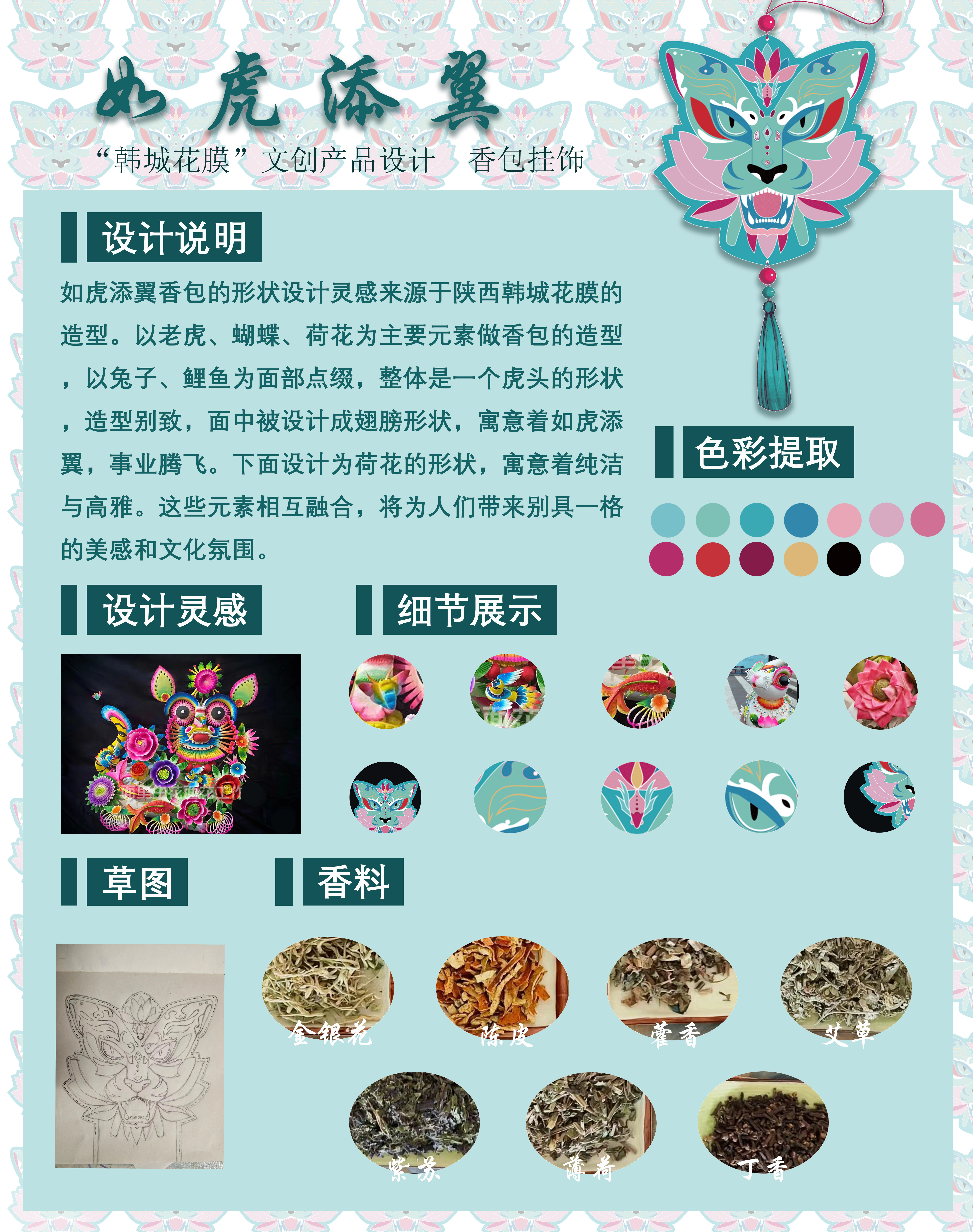 如虎添翼香包的形状设计灵感来源于陕西韩城花膜的造型。以老虎、蝴蝶、荷花为主要元素做香包的造型,以兔子、鲤鱼为面部点缀,整体是一个虎头的形状,造型别致,面中被设计成翅膀形状,寓意着如虎添翼,事业腾飞。下面设计为荷花的形状,寓意着纯洁与高雅。这些元素相互融合,将为人们带来别具一格的美感和文化氛围。