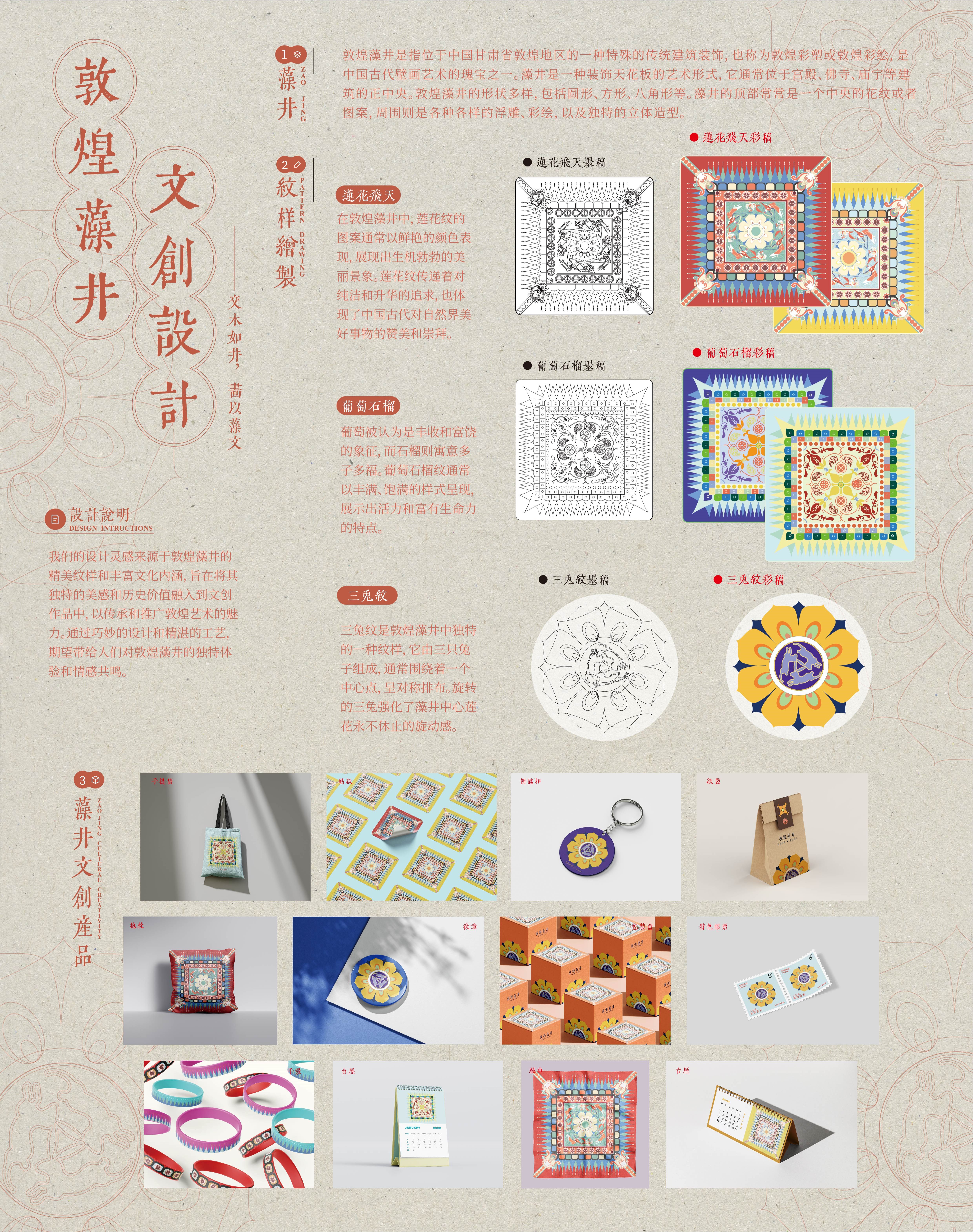 藻井是一种装饰天花板的艺术形式,它通常位于宫殿、佛寺、庙宇等建筑的正中央。敦煌藻井的形状多样,包括圆形、方形、八角形等。藻井的顶部常常是一个中央的花纹或者图案,周围则是各种各样的浮雕、彩绘,以及独特的立体造型。我们的设计灵感来源于敦煌藻井的精美纹样和丰富文化内涵,旨在将其独特的美感和历史价值融入到文创作品中,以传承和推广敦煌艺术的魅力。