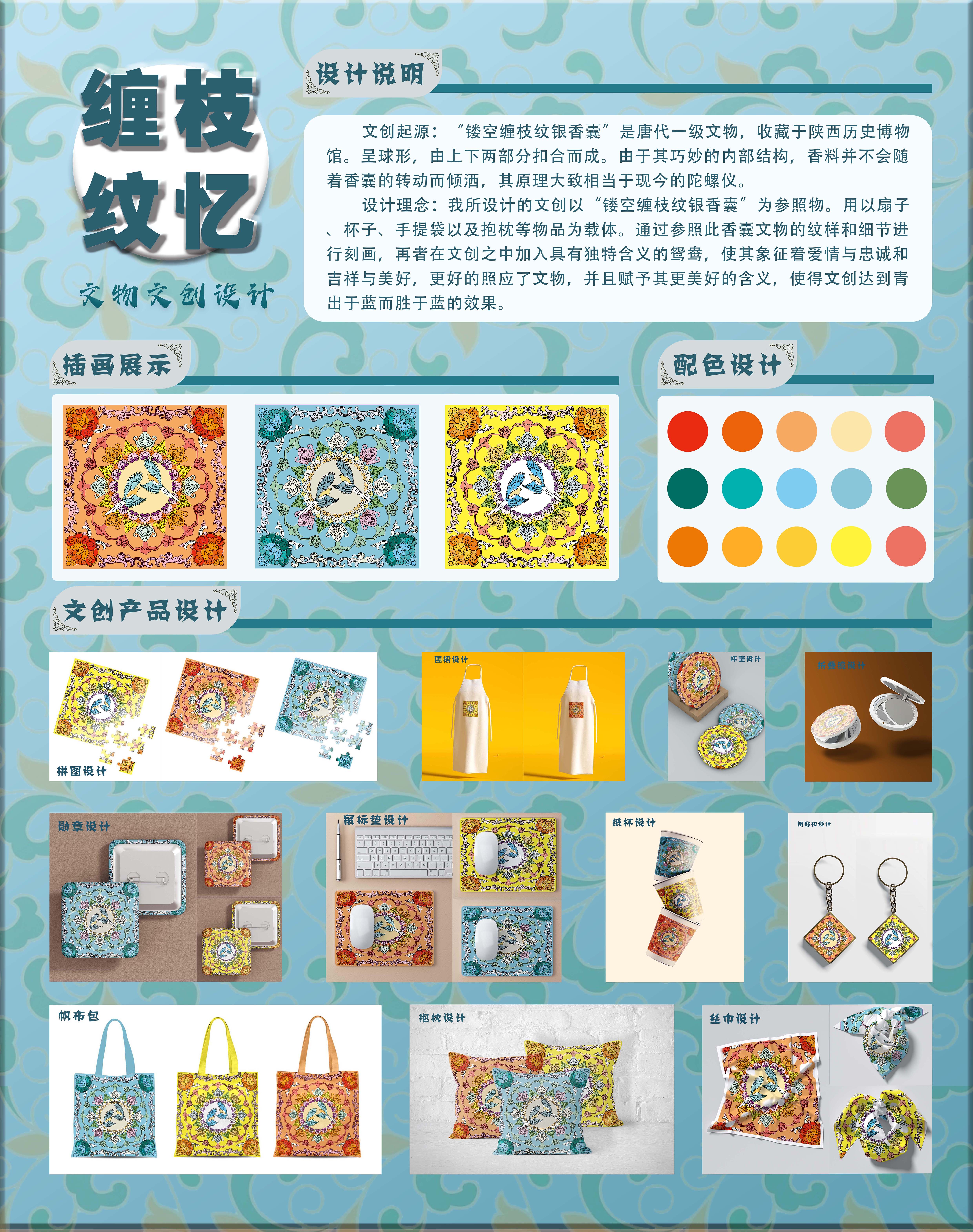 设计理念:我所设计的文创以“镂空缠枝纹银香囊”为参照物。用以扇子、杯子、手提袋以及抱枕等物品为载体。通过参照此香囊文物的纹样和细节进行刻画,再者在文创之中加入具有独特含义的鸳鸯,使其象征着爱情与忠诚和吉祥与美好,更好的照应了文物,并且赋予其更美好的含义,使得文创达到青出于蓝而胜于蓝的效果。