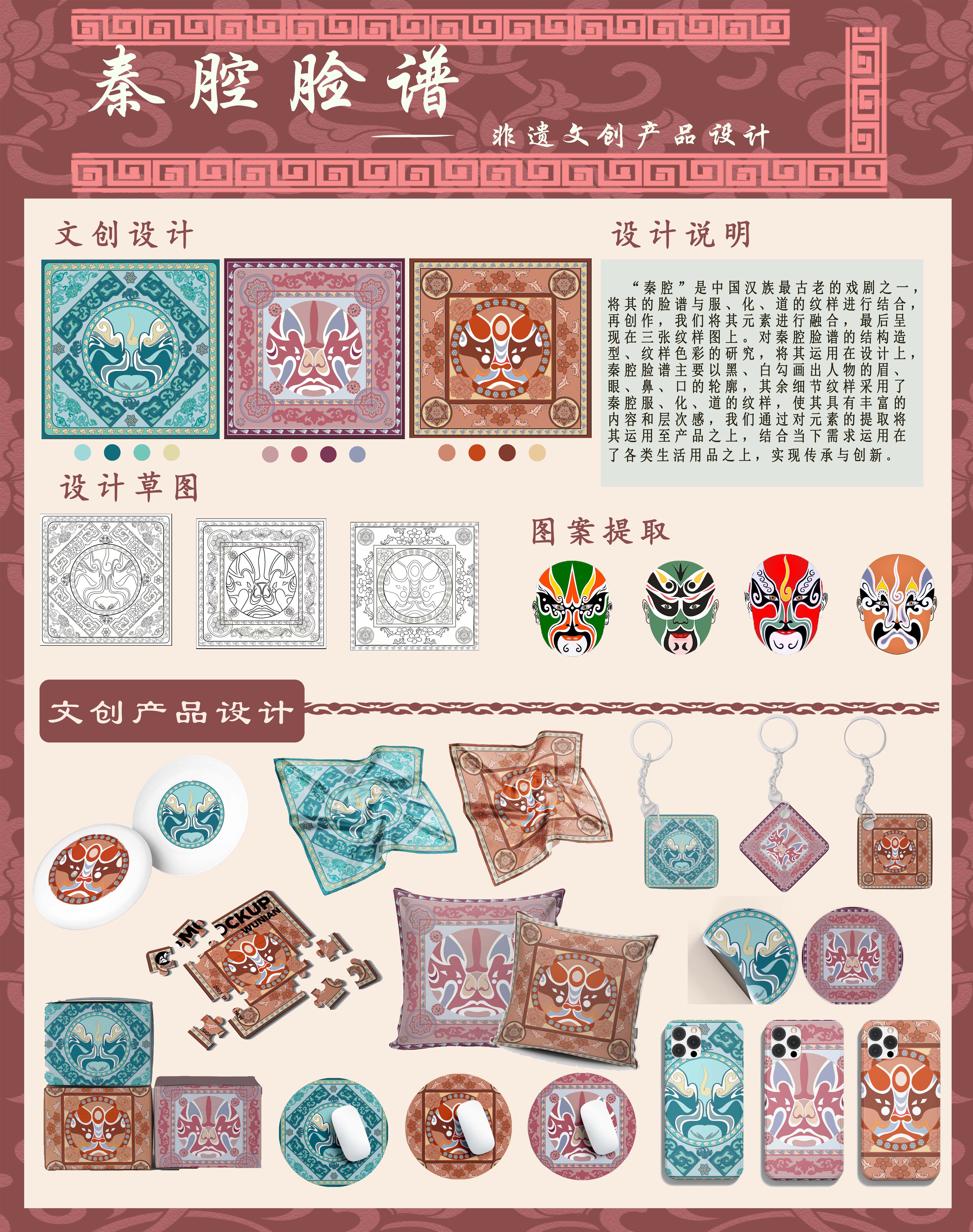 “秦腔”是中国汉族最古老的戏剧之一,将其的脸谱与服、化、道的纹样进行结合,再创作,我们将其元素进行融合,最后呈现在三张纹样图上。对秦腔脸谱的结构造型、纹样色彩的研究,秦腔脸谱主要以黑、白勾画出人物的眉、眼、鼻、口的轮廓,其余细节纹样采用了秦腔服、化、道的纹样,使其具有丰富的内容和层次感,我们通过对元素的提取将其运用至产品之上,结合当下需求运用在了各类生活用品之上,实现传承与创新。