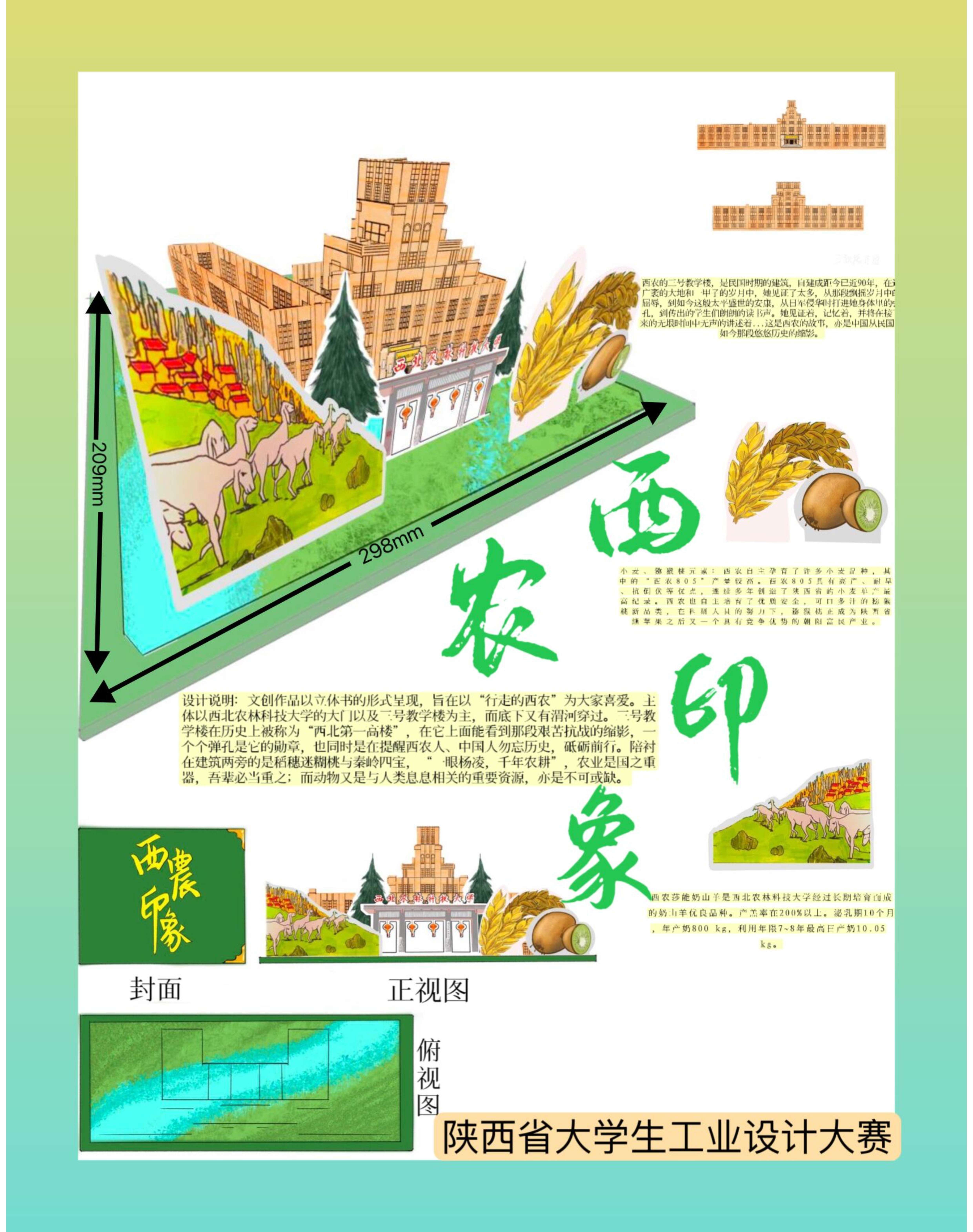 文创作品以立体书的形式呈现,旨在以“行走的西农”为大家喜爱。主体以西北农林科技大学的大门以及三号教学楼为主。三号教学楼在历史上被称为“西北第一高楼”,在它上面能看到那段艰苦抗战的缩影,一个个弹孔是它的勋章,也同时是在提醒西农人、中国人勿忘历史,砥砺前行。陪衬在建筑两旁的是稻穗迷糊桃与羊,“一眼杨凌,千年农耕”,农业是国之重器,吾辈必当重之;而动物又是与人类息息相关的重要资源,亦是不可或缺。