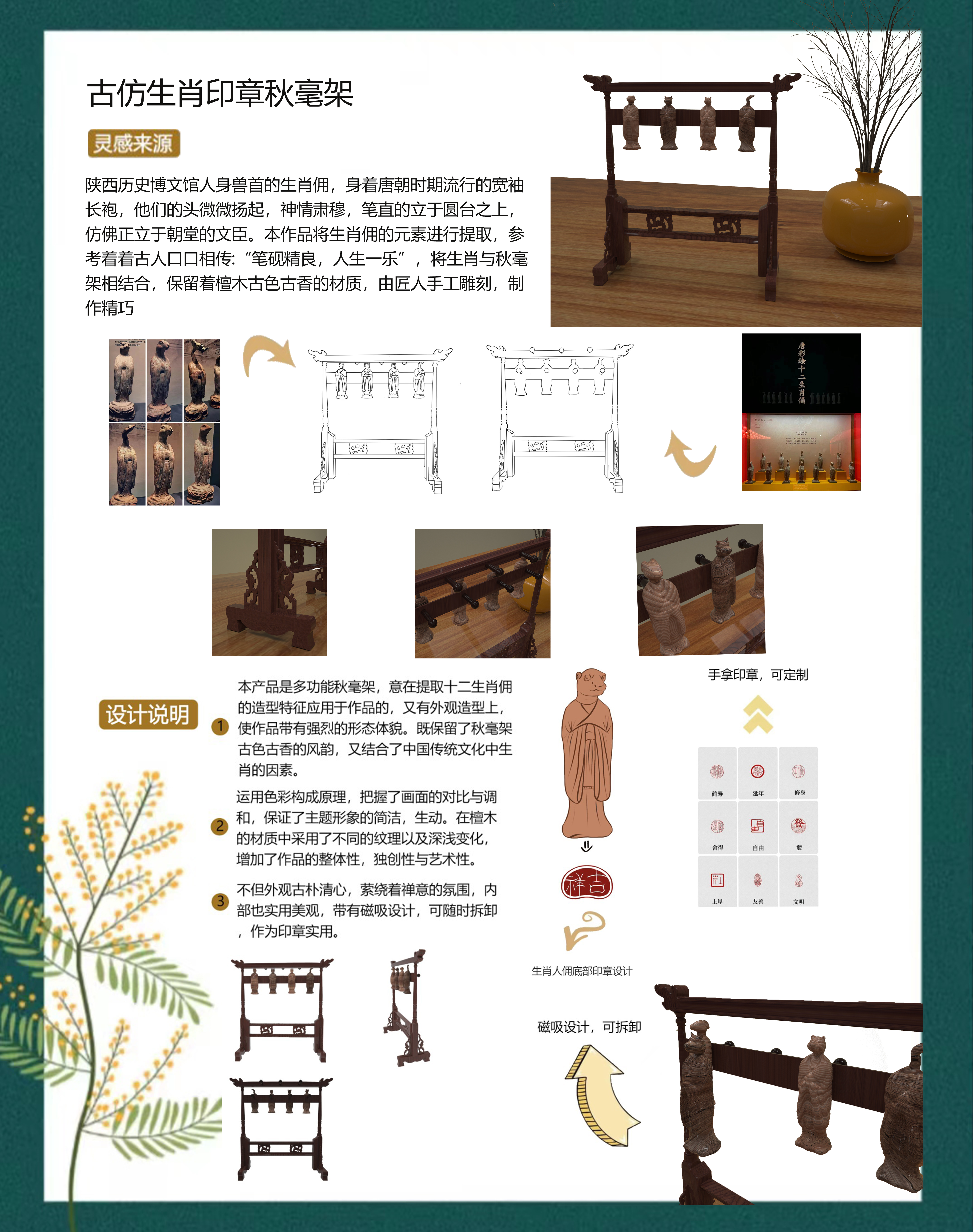 本产品是多功能秋毫架,意在提取十二生肖佣的造型特征应用于作品的,又有外观造型上,使作品带有强烈的形态体貌。既保留了秋毫架古色古香的风韵,又结合了中国传统文化中生肖的因素。 在檀木的材质中采用了不同的纹理以及深浅变化,增加了作品的整体性,独创性与艺术性。不但外观古朴清心,萦绕着禅意的氛围,内部也实用美观,带有磁吸设计,可随时拆卸,作为印章使用·。