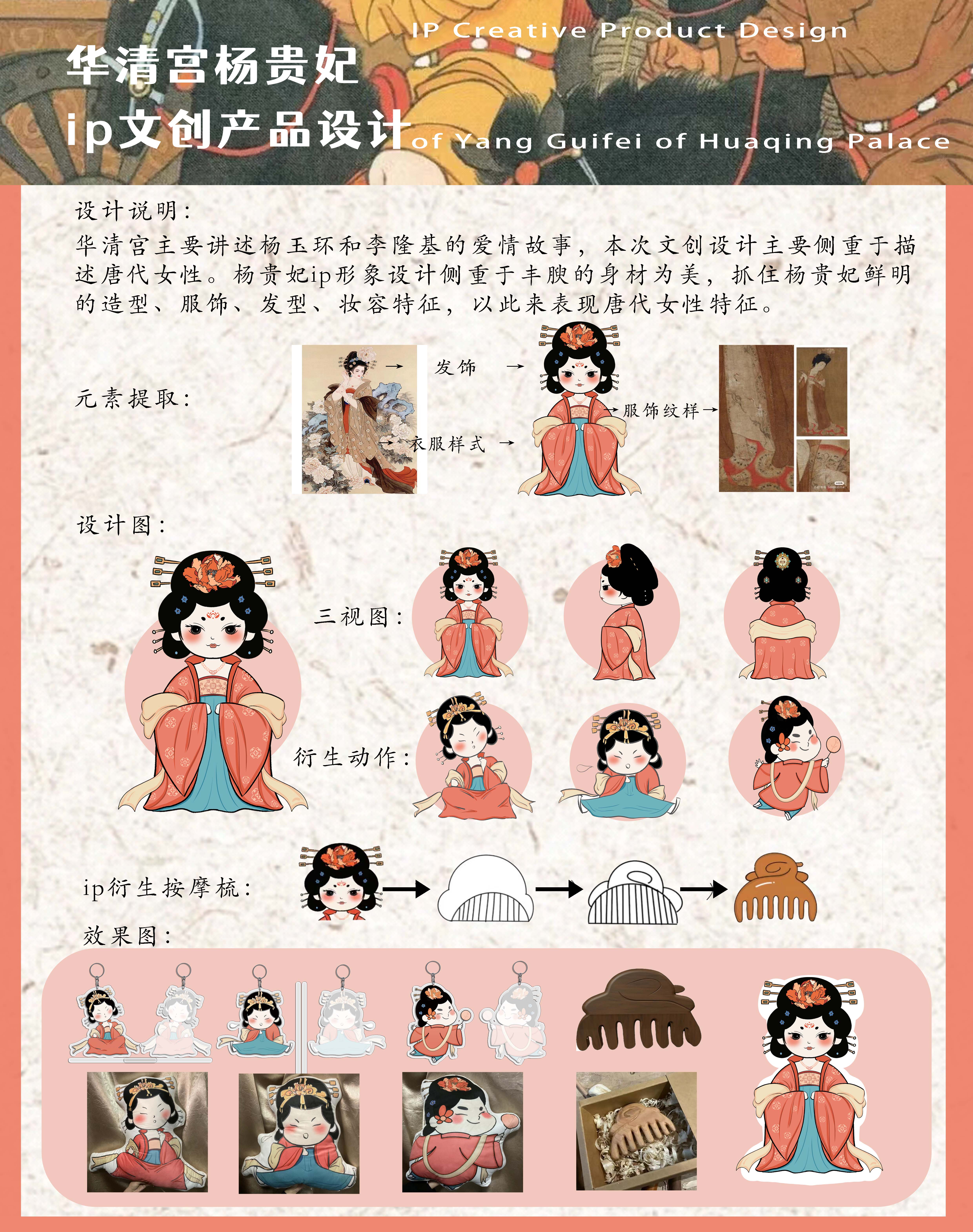 华清宫主要讲述杨玉环和李隆基的爱情故事,本次文创设计主要侧重于描述唐代女性。杨贵妃ip形象设计侧重于丰腴的身材为美,抓住杨贵妃鲜明的造型、服饰、发型、妆容特征,以此来表现唐代女性特征。