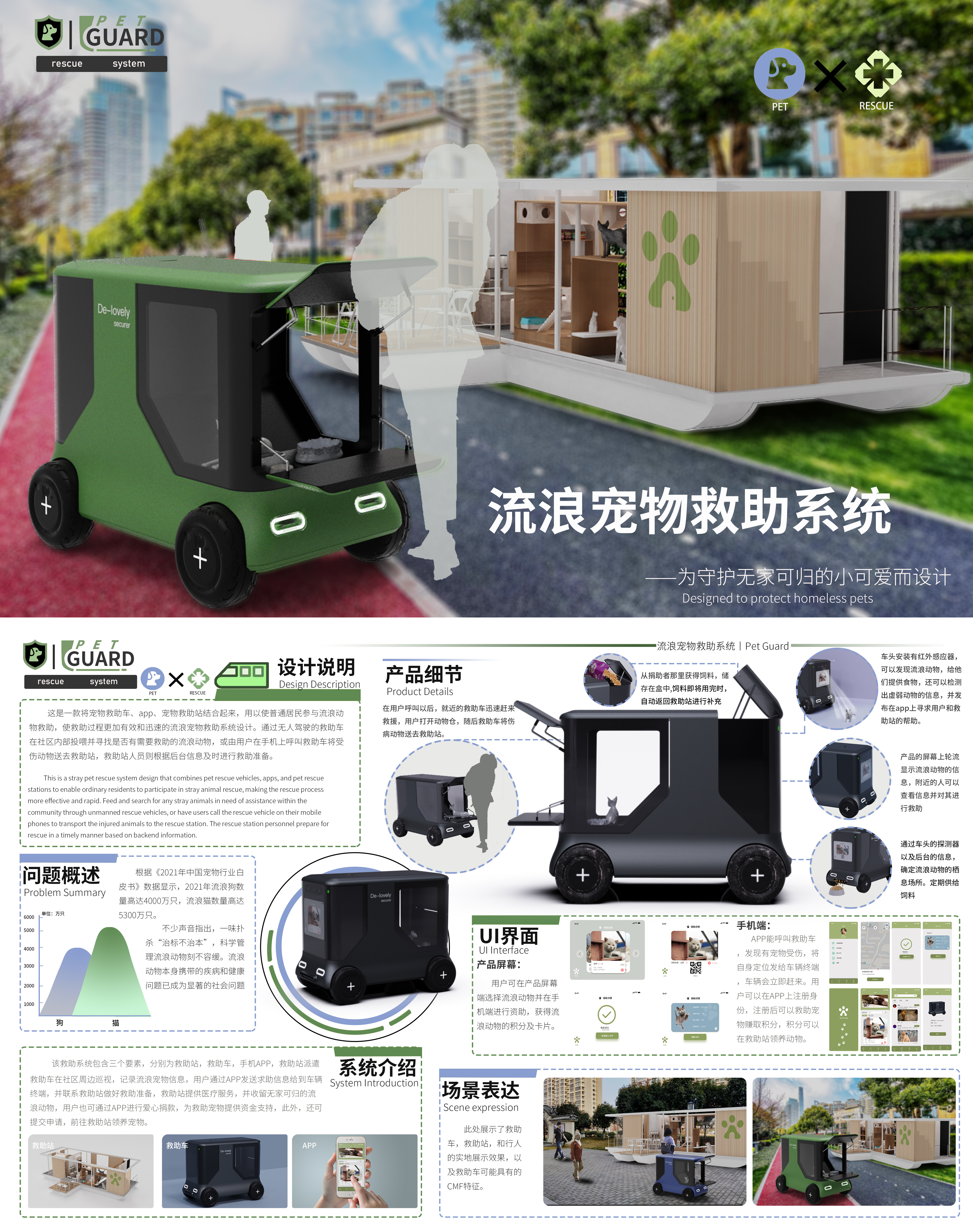 随着社区内流浪动物的增多,流浪动物和人之间正确的和谐相处成为了一个显著的问题。这是一款将宠物救助车、app、宠物救助站结合起来,用以使普通居民参与流浪动物救助,使救助过程更加有效和迅速的流浪宠物救助系统设计。通过无人驾驶的救助车在社区内部投喂并寻找是否有需要救助的流浪动物,或由用户在手机上呼叫救助车将受伤动物送去救助站,救助站人员则根据后台信息及时进行救助准备。
