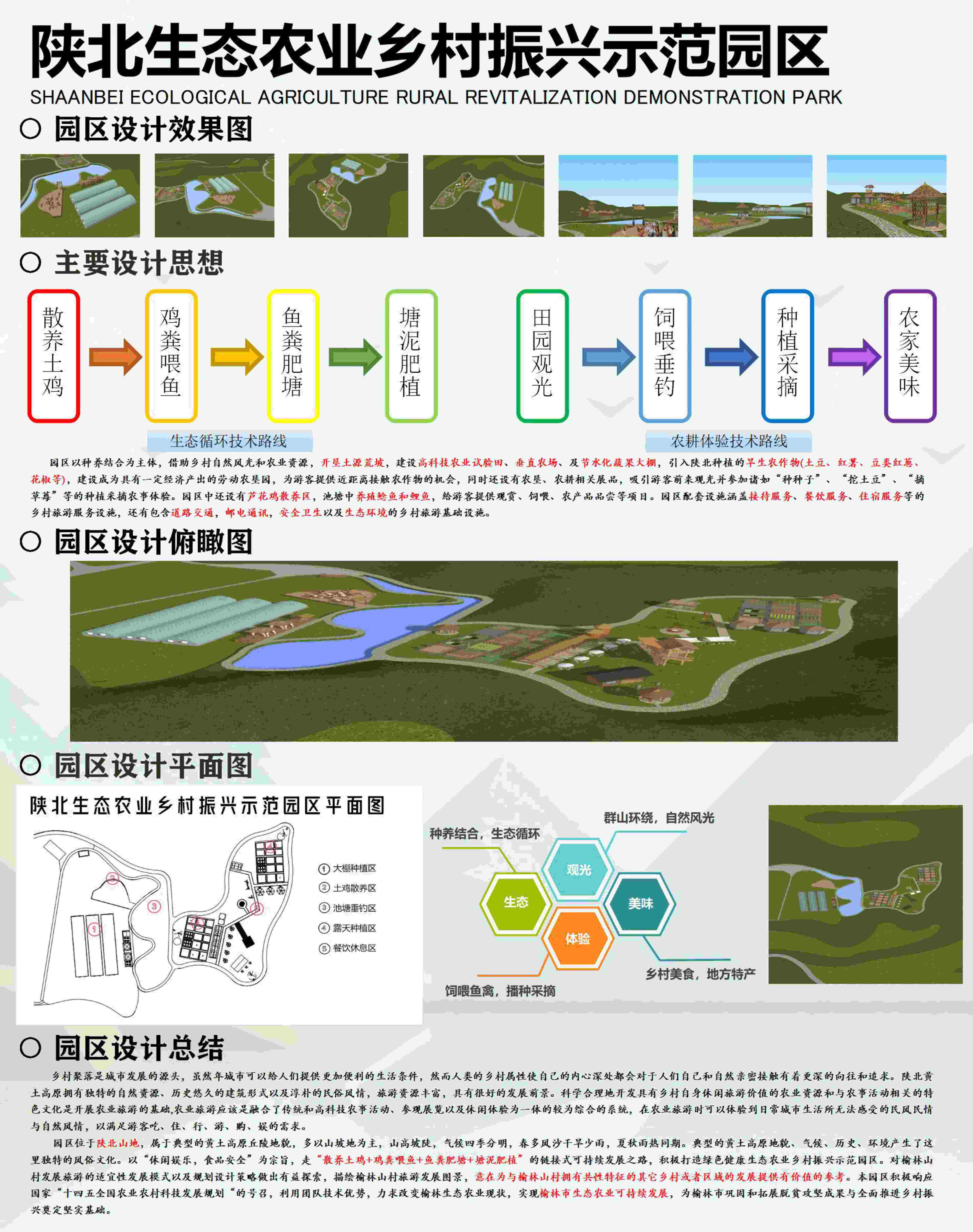 园区位于陕北山地,典型的黄土高原地貌、气候、历史、环境产生了这里独特的风俗文化。以“休闲娱乐,食品安全”为宗旨,走“散养土鸡+鸡粪喂鱼+鱼粪肥塘+塘泥肥植”的链接式可持续发展之路,积极打造绿色健康生态农业乡村振兴示范园区。对榆林山村发展旅游的适宜性发展模式以及规划设计策略做出有益探索,描绘榆林山村旅游发展图景,意在为与榆林山村拥有共性特征的其它乡村或者区域的发展提供有价值的参考。