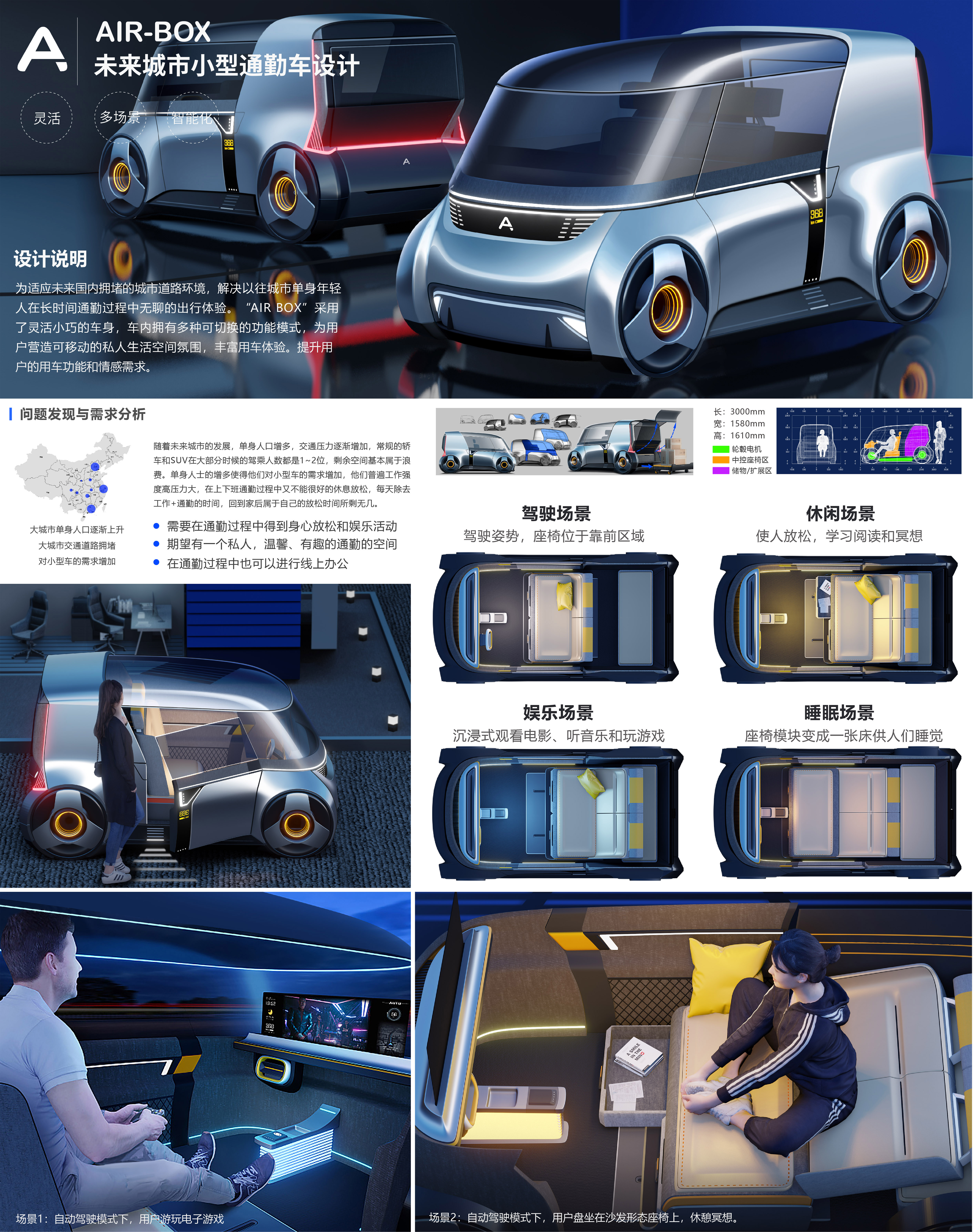 随着未来城市的发展,单身人口增多,对小型车的需求增加,他们普遍工作强度高压力大,在上下班通勤过程中又不能很好的休息放松,回到家后属于自己的放松时间所剩无几。为适应未来国内拥堵的城市道路环境,解决以往城市单身年轻人在长时间通勤过程中无聊的出行体验。AIR BOX采用了灵活小巧的车身,车内拥有多种可切换的功能模式,为用户营造可移动的私人生活空间氛围,丰富用车体验。提升用户的用车功能和情感需求。