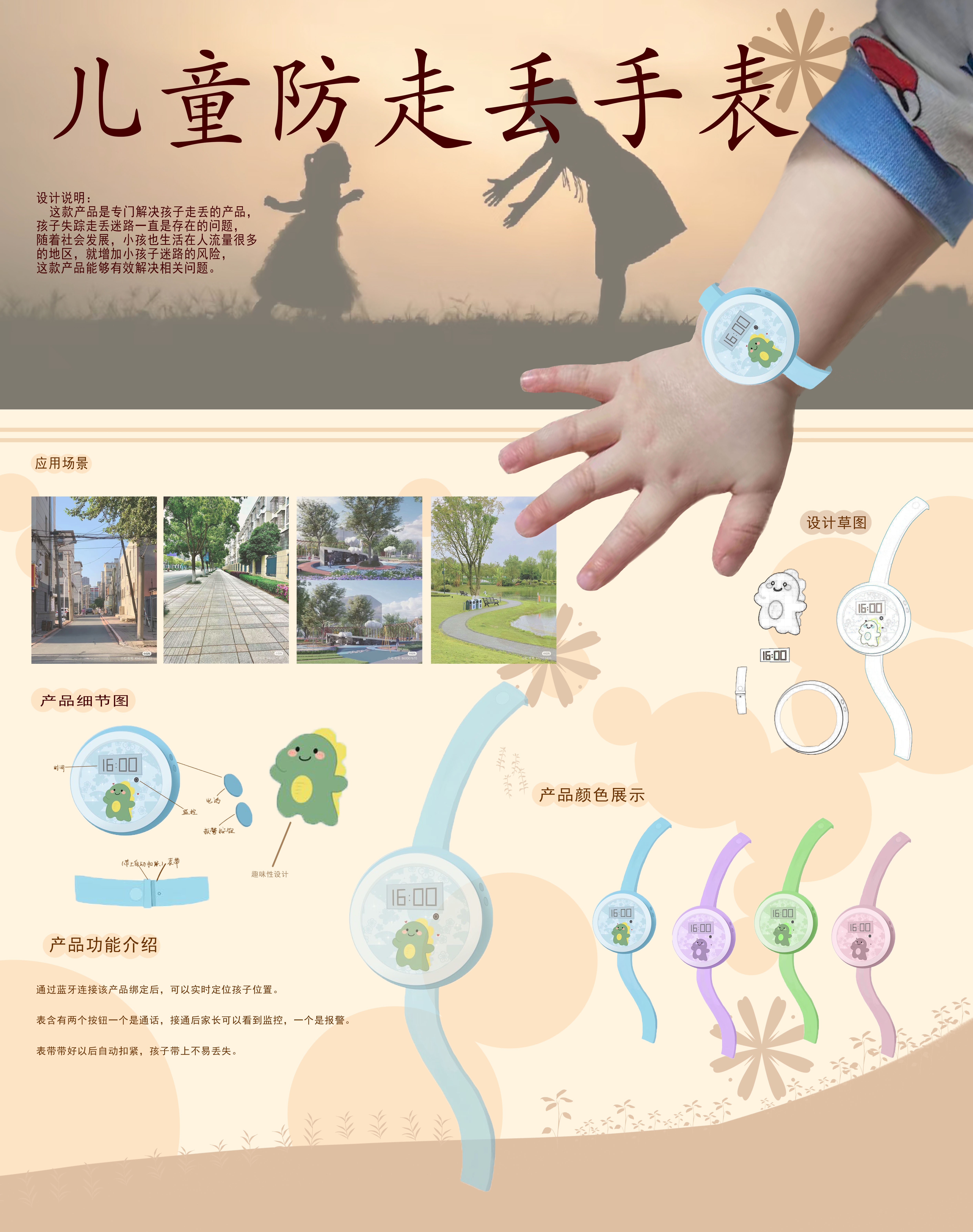 这款产品是专门解决孩子走丢的产品,孩子失踪、走丢、迷路一直是现在存在的问题,随着社会的发展,小孩子也生活在人流量很多的地区,就增加小孩迷路的风险,所以这款产品能够有效解决相关问题,它的主要功能就是定位、通话、报警,使儿童走失后第一时间找到孩子位置。