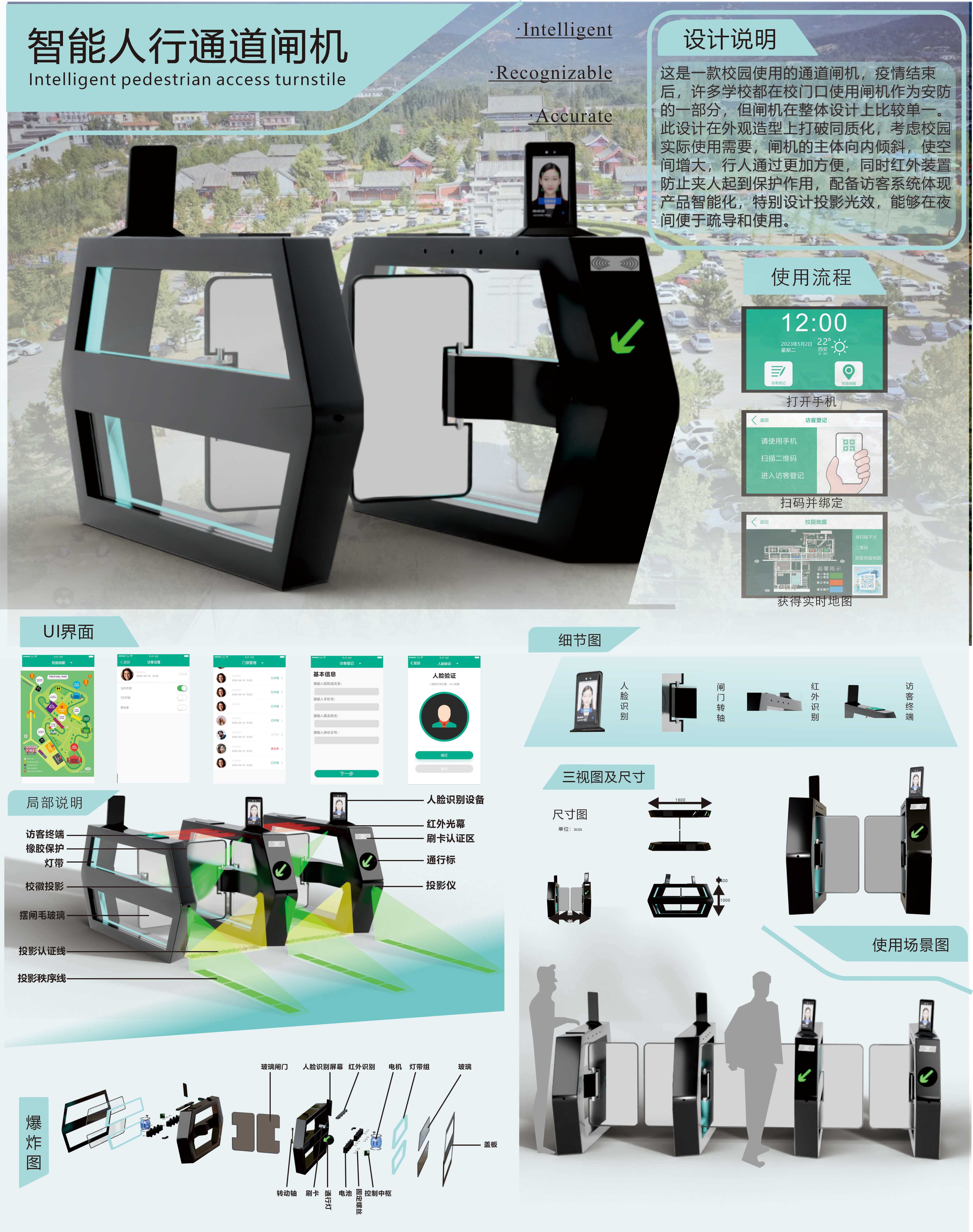 这是一款校园使用的通道闸机,疫情结束后,许多学校都在校门口使用闸机作为安防的一部分,但闸机在整体设计上比较单一。此设计在外观造型上打破同质化,考虑校园实际使用需要,闸机的主体向内倾斜,使空间增大,行人通过更加方便,同时红外装置防止夹人起到保护作用,配备访客系统体现产品智能化,特别设计投影光效,能够在夜间便于疏导和使用。