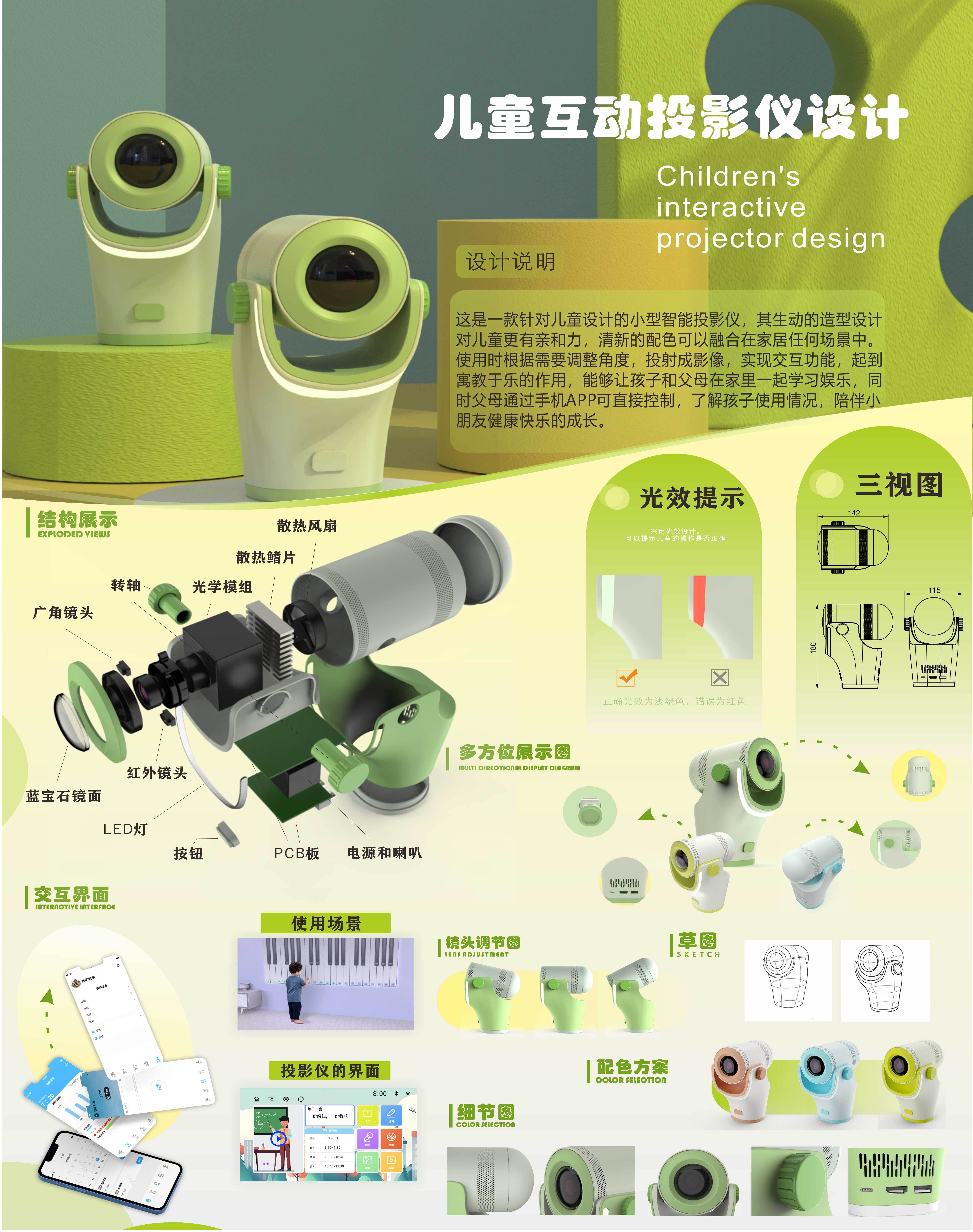 这是一款针对儿童设计的小型智能投影仪,其生动的造型设计对儿童更有亲和力,清新的配色可以融合在家居任何场景中。使用时根据需要调整角度,投射成影像,实现交互功能,起到寓教于乐的作用,能够让孩子和父母在家里一起学习娱乐,同时父母通过手机APP可直接控制,了解孩子使用情况,陪伴小朋友健康快乐的成长。