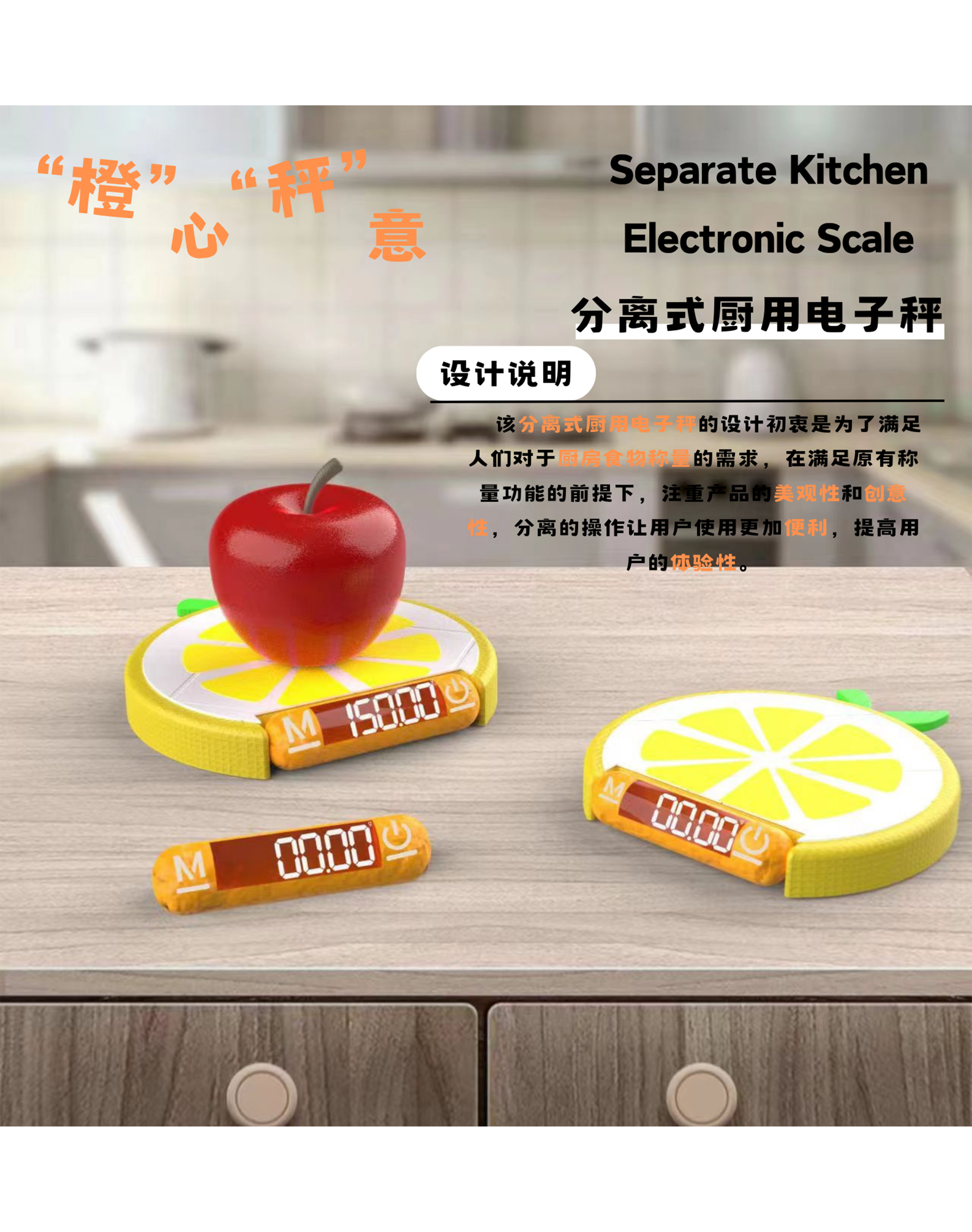 随着互联网的兴起,人们越来越热衷于学习网上的视频做饭。而网上的教程又严格规定了所需食物的重量,因此该款分离式厨用电子秤的设计初衷就是为了满足人们能够在厨房内精准的称取所需要的食物,在满足原有的功能外,设计出更好的外观,注重产品的美观性和创意性,让沉闷的厨房充满清新的感觉,分离的操作更加注重用户的体验,提高用户的便利性和体验性。