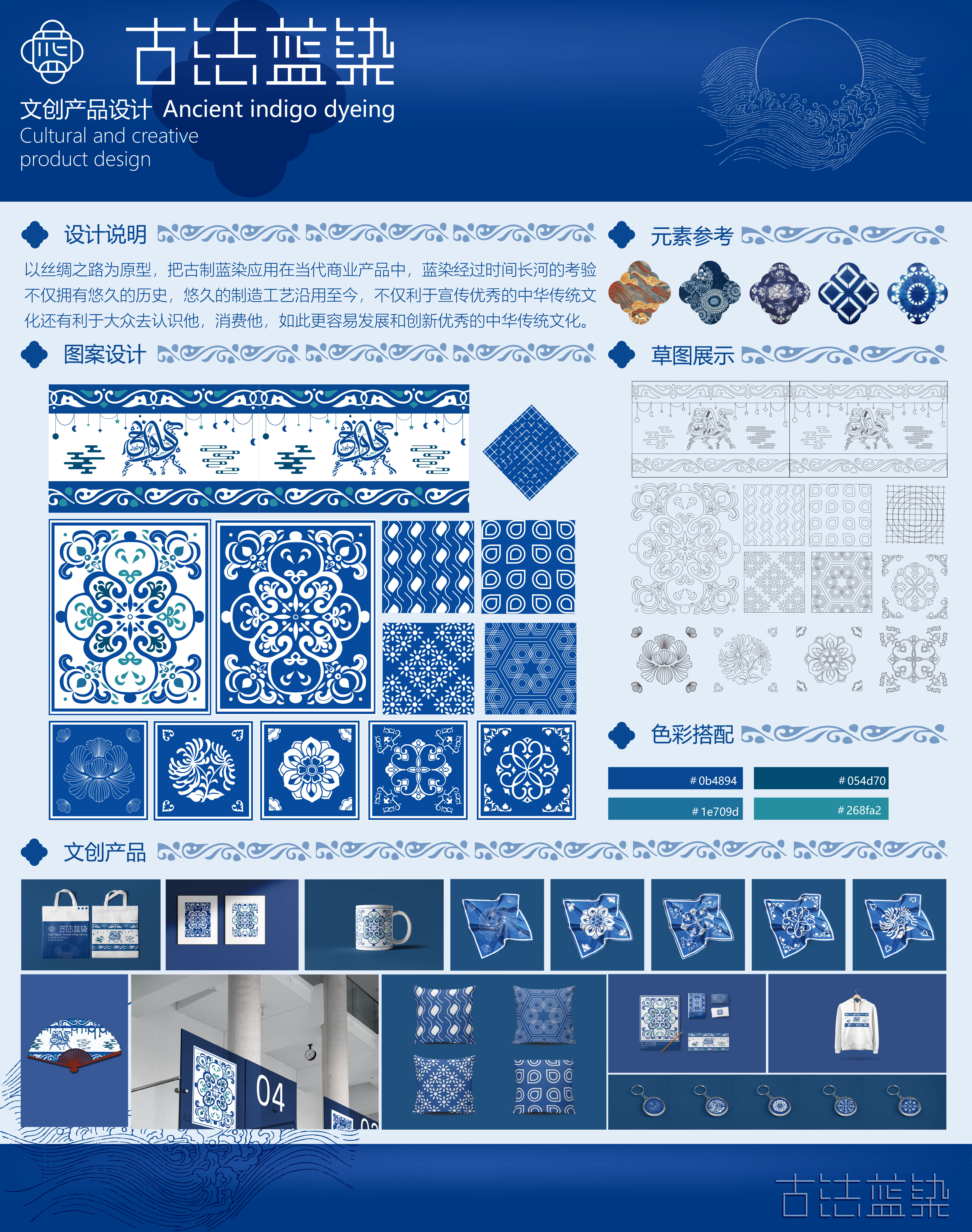 以丝绸之路为原型,把古制蓝染应用在当代商业产品中,蓝染经过时间长河的考验不仅拥有悠久的历史,悠久的制造工艺沿用至今,不仅利于宣传优秀的中华传统文化还有利于大众去认识他,消费他,如此更容易发展和创新优秀的中华传统文化。