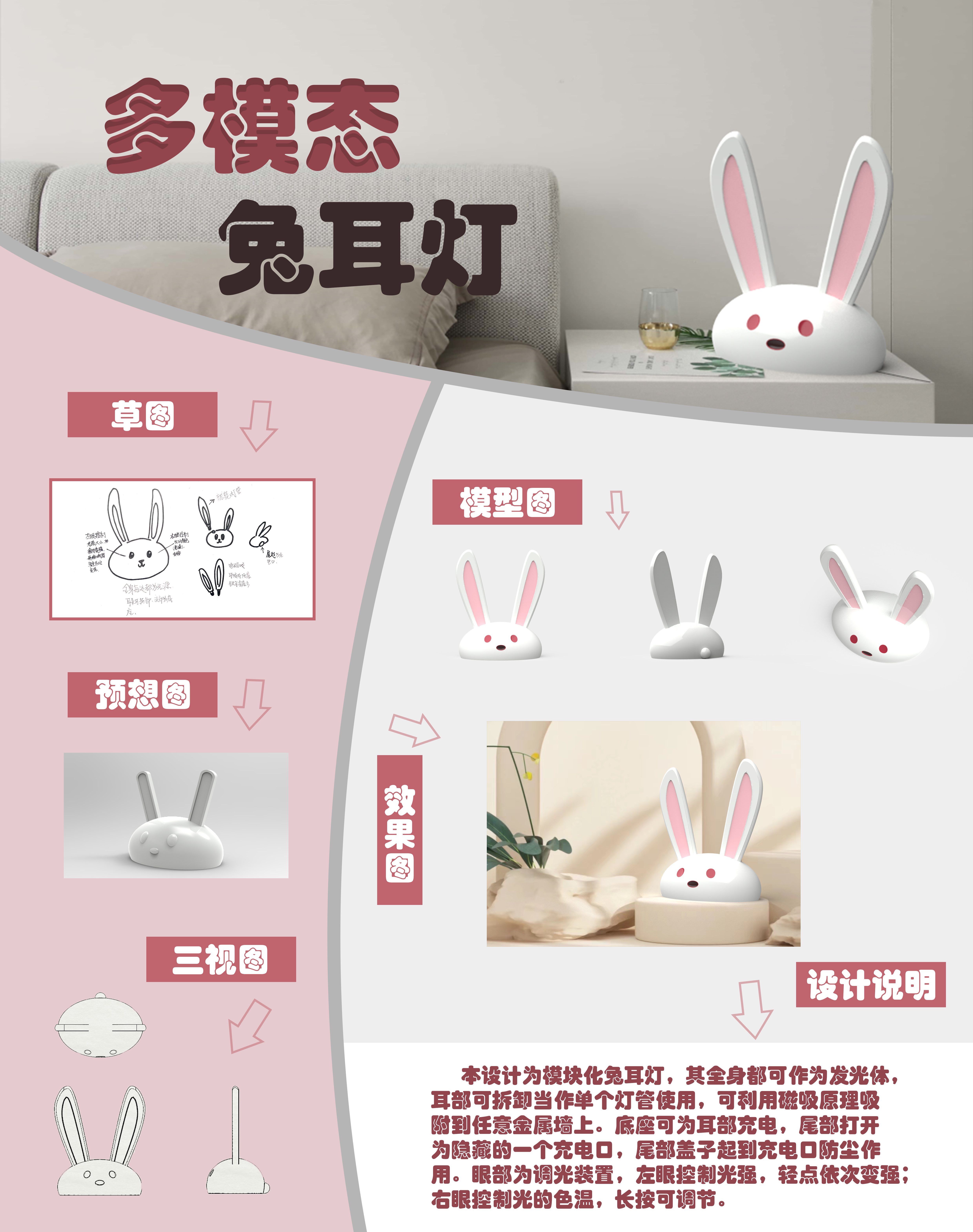 本设计为模块化兔耳灯,其全身都可作为发光体,耳部可拆卸当作单个灯管使用,可利用磁吸原理吸附到任意金属墙上。底座可为耳部充电,尾部打开为隐藏的一个充电口,尾部盖子起到充电口防尘作用。眼部为调光装置,左眼控制光强,轻点依次变强;右眼控制光的色温,长按可调节。