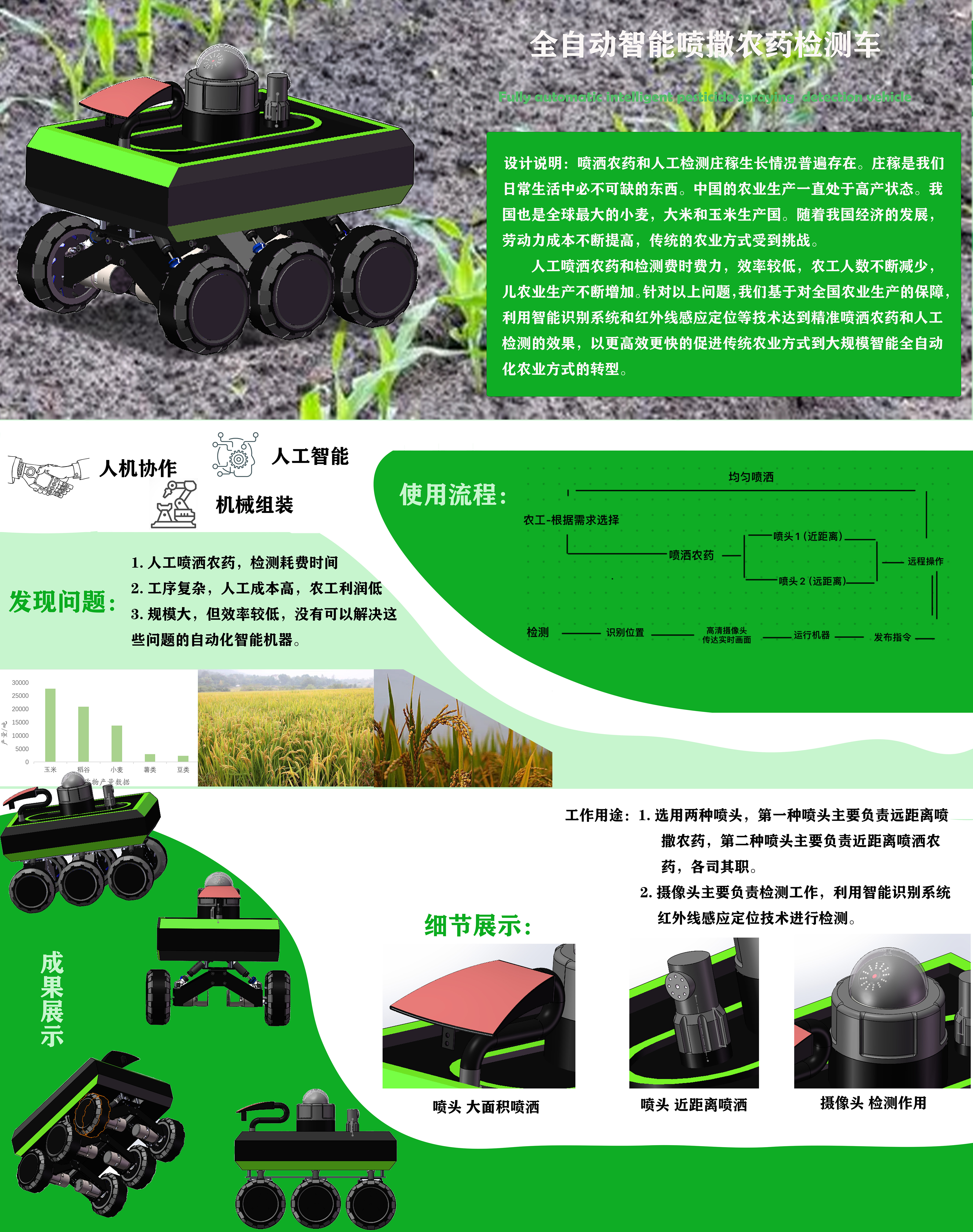 设计说明:人工喷酒农药和检测费时费力,效率较低,农工人数不断減少,儿农业生产不断培加。针对以上问题,我们基于对全国农业生产的保障,利用智能识别系统和红外线感应定位等技术达到精准喷酒农药和人工检测的效果,以更高效更快的促进传統农业方式到大规模智能全自动化农业方式的转型。