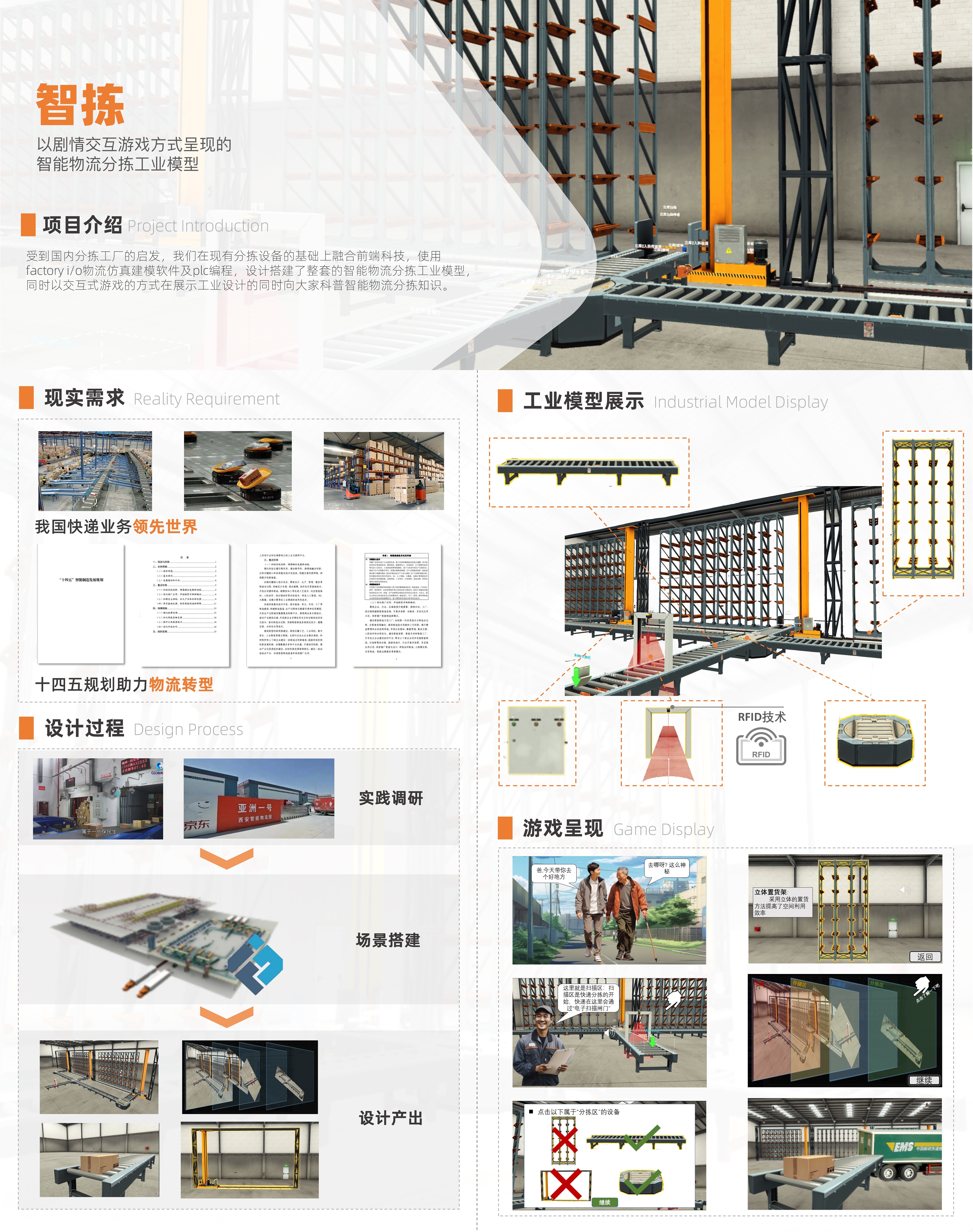 实地考察西安京东“亚洲一号”快递分拣工厂后,我们受到启发,在现有分拣设备基础上融合RFID射频技术等前端科技,使用factory i/o物流仿真建模软件及西门子PLC编程来进行所设想的工业场景的设计、建模与搭建。最后以交互式游戏的方式来展现最终的工业设计、工程场景,并且普及我国智能物流分拣知识,达到寓教于乐,体现中国智能制造高质量发展的目的。