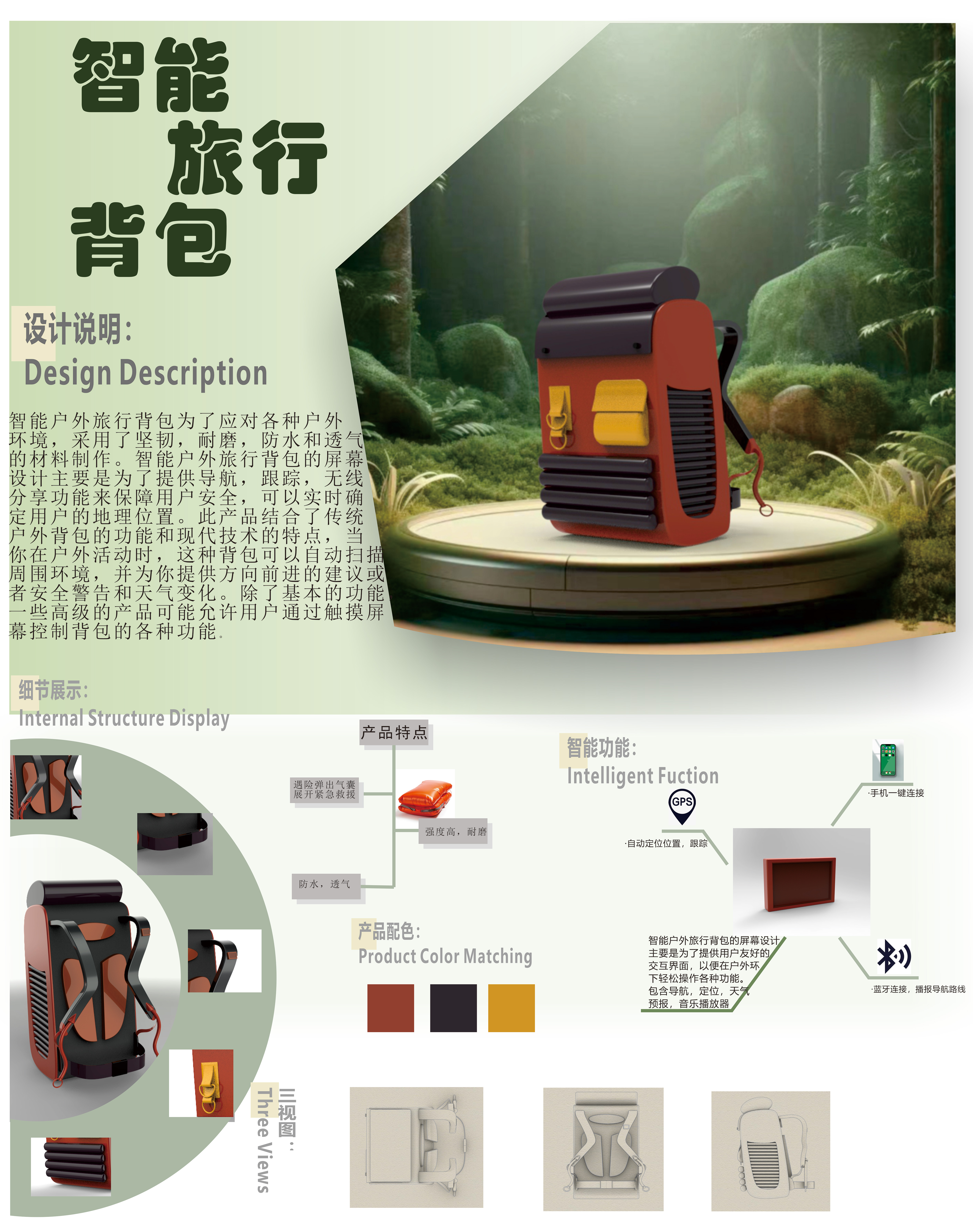 智能旅行背包采用时尚简约的设计风格,适合各种场合使用。选用耐磨、防水、防撕裂的材料制作,确保背包的耐用性。背包空间合理同时具备救援气垫,支持太阳能充电,户外旅行时可通过阳光为背包充电。背包内置心率监测器,可实时监测用户心率,提醒用户注意身体状况。可实时监测周围环境参数,如温度、湿度。通过蓝牙与手机连接,实现来电提醒、短信提醒等功能可通过手机APP与其他智能旅行背包进行互联,分享行程信息。