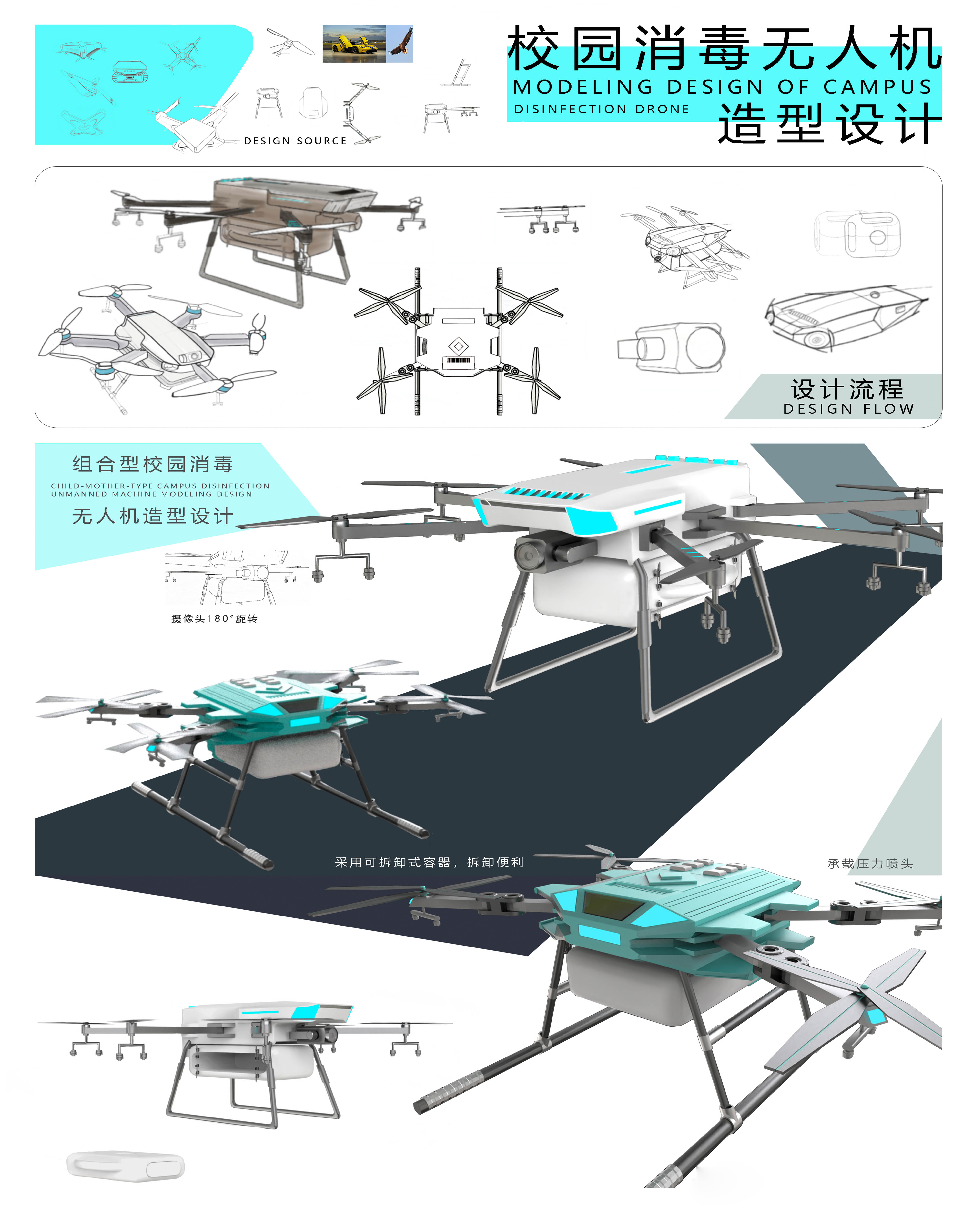 本次设计是针对校园环境,后疫情时代我们在公共场所也应该定时消杀,本次设计针对校园大小环境。母机负责室外以及大教室的消毒工作,子机负责教室、走廊等小型场所,并且按照规定的路线自动巡逻并消杀,在不用消毒时,还可以浇花,并且监测整个校园环境,利用模块化的概念,对消毒无人机进行方案设计,最大程度的响应国家环保号召。不仅节省生产成本,增加使用效率的同时还增大了使用者的选择空间。