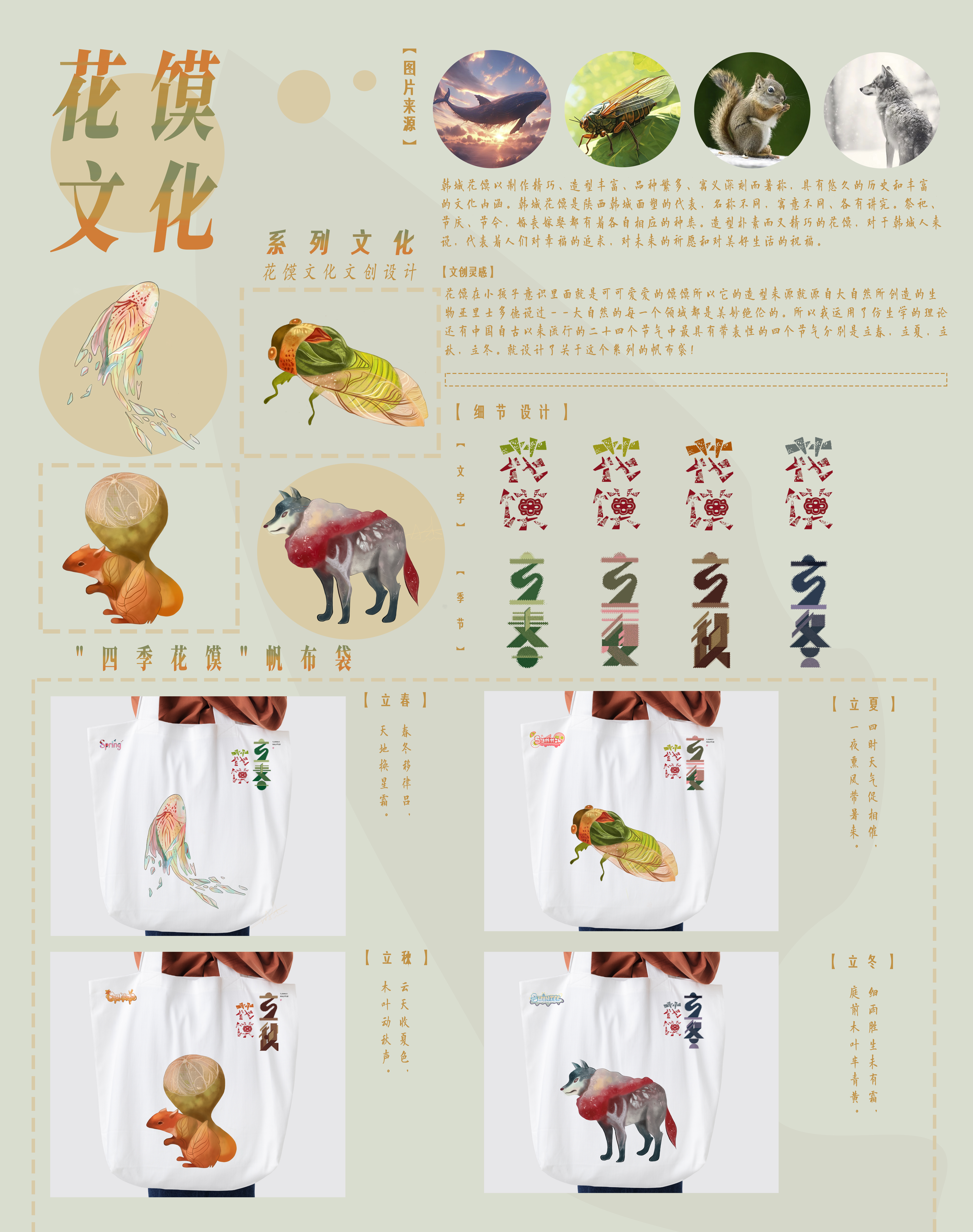 花馍在小孩子意识里面就是可可爱爱的馍馍,所以它的造型来源就源自大自然所创造的生物。亚里士多德说过——大自然的每一个领域都是美妙绝伦的。所以我运用了仿生学的理论,还有中国自古以来流行的二十四个节气中最具有带表性的四个节气分别是立春,立夏,立秋,立冬。就设计了关于这个系列的帆布袋!