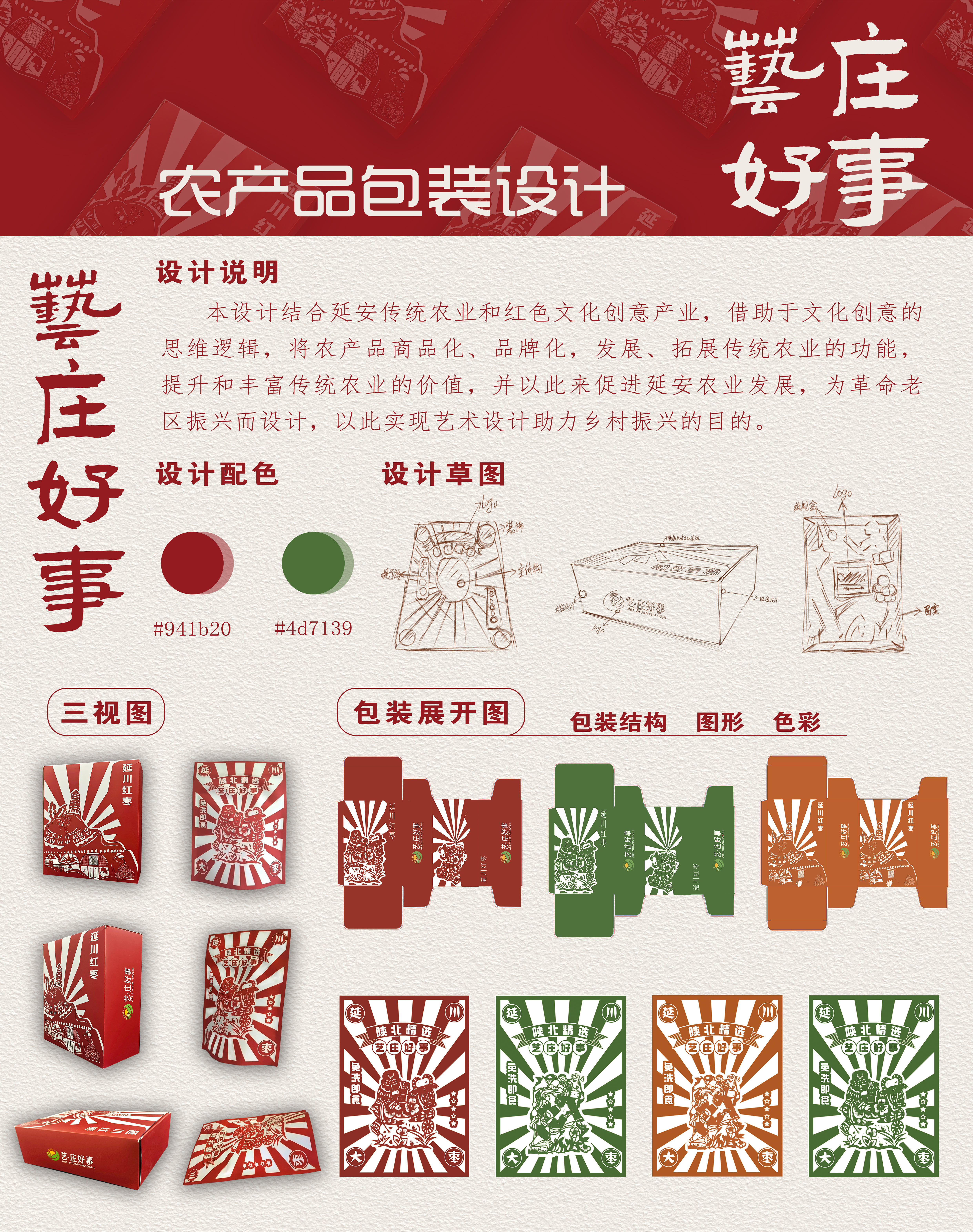 本设计结合延安传统农业和红色文化创意产业,借助于文化创意的思维逻辑,将农产品商品化、品牌化,发展、拓展传统农业的功能,提升和丰富传统农业的价值,并以此来促进延安农业发展,为革命老区振兴而设计,以此实现艺术设计助力乡村振兴的目的。