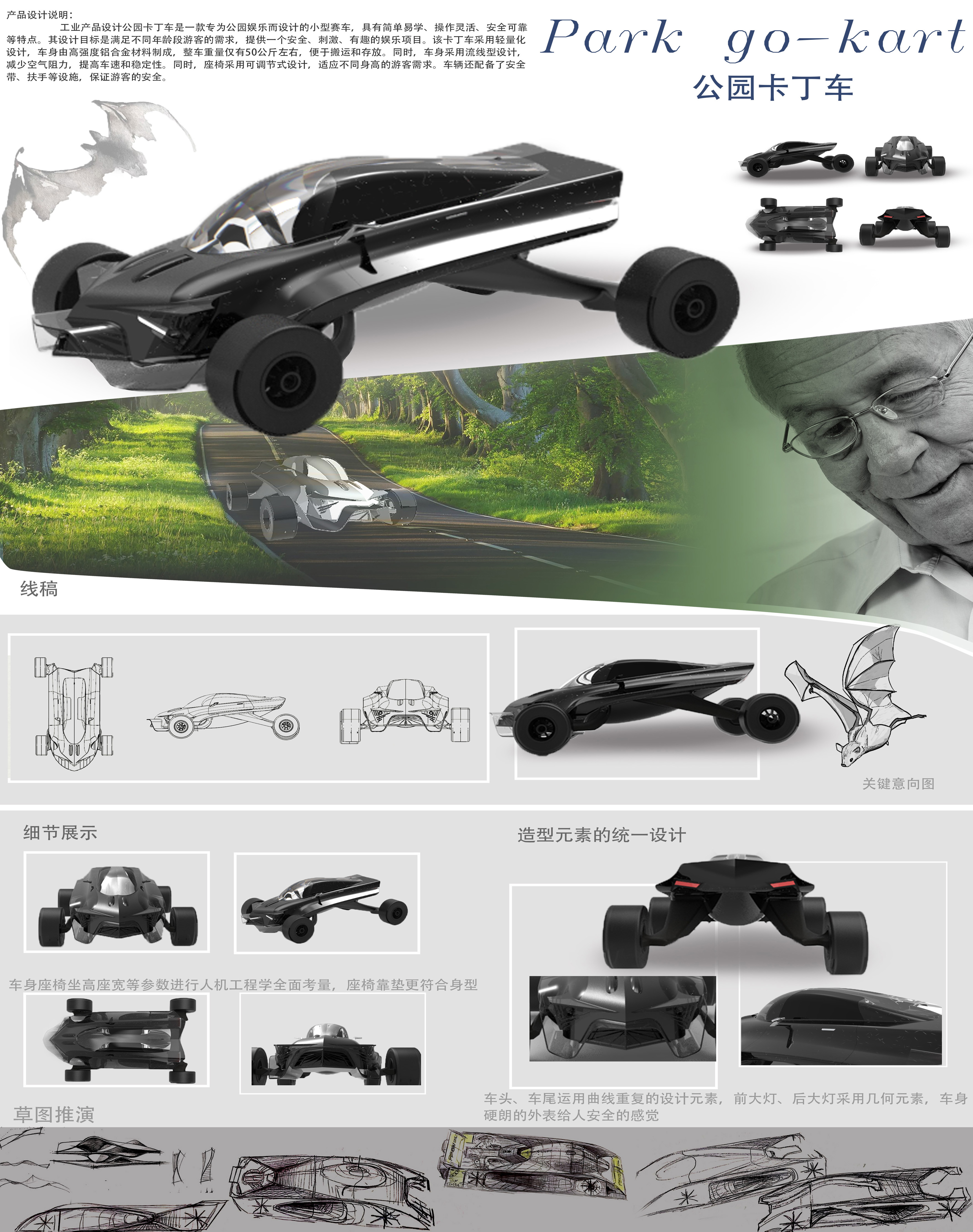 工业产品设计公园卡丁车是一款专为公园娱乐而设计的小型赛车,具有简单易学、操作灵活、安全可靠等特点。其设计目标是满足不同年龄段游客的需求,提供一个安全、刺激、有趣的娱乐项目。该卡丁车采用轻量化设计,车身由高强度铝合金材料制成,整车重量仅有50公斤左右,便于搬运和存放。同时,车身采用流线型设计,减少空气阻力,提高车速和稳定性。同时,座椅采用可调节式设计,适应不同身高的游客需求。