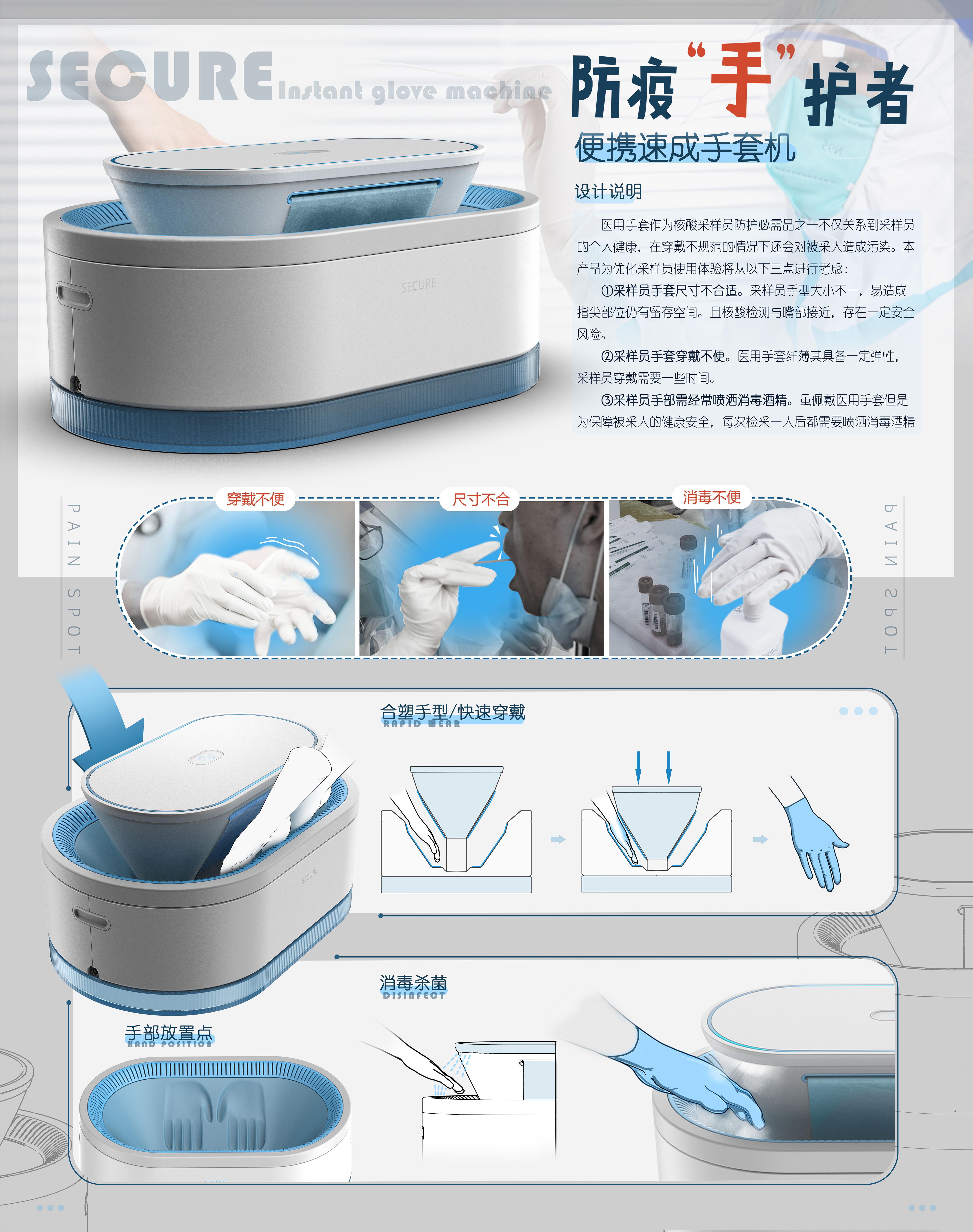 医用手套作为核酸采样员防护必需品之一不仅关系到采样员的个人健康 本产品为优化采样员使用体验将从以下三点进行考虑 1采样员手套尺寸不合适,采样员手型大小不一。易造成指尖部位有留存空间,且核酸检测与嘴部接近,存在一定安全风险 2采样员手套穿戴不便。医用手套纤薄其具备一定弹性采样员穿戴需要一些时间 3采样员手部需经常喷洒消毒酒精。虽佩戴医用手套但是为保障被采人的健康安全,每次检采一人后都需要喷洒消毒酒精