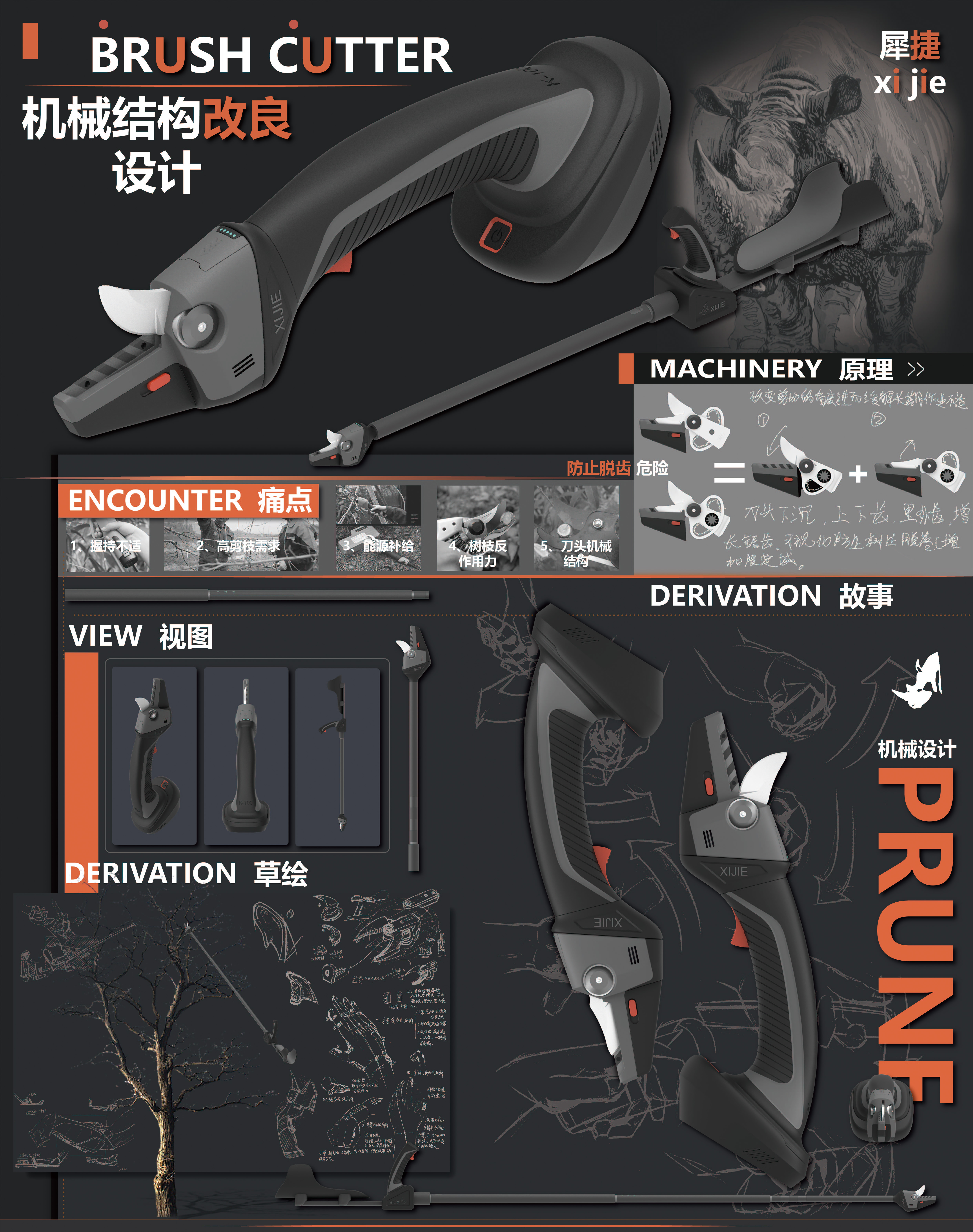 本次设计主要针对5点进行分析设计: 1、刀头下沉,从而改变剪切的角度进而缓解手部长期作业的不适感。 2、高剪枝滑动机构增加使用寿命。 3、背甲携带电池进行电量补充。 4、刀头小设计:定刀头的外侧突起斜角对树枝起到抵挡推出作用。 5、刀头反切捏合、增长锯齿、可视化防止树枝掉落。(上下齿、里外齿,增加限定域。)