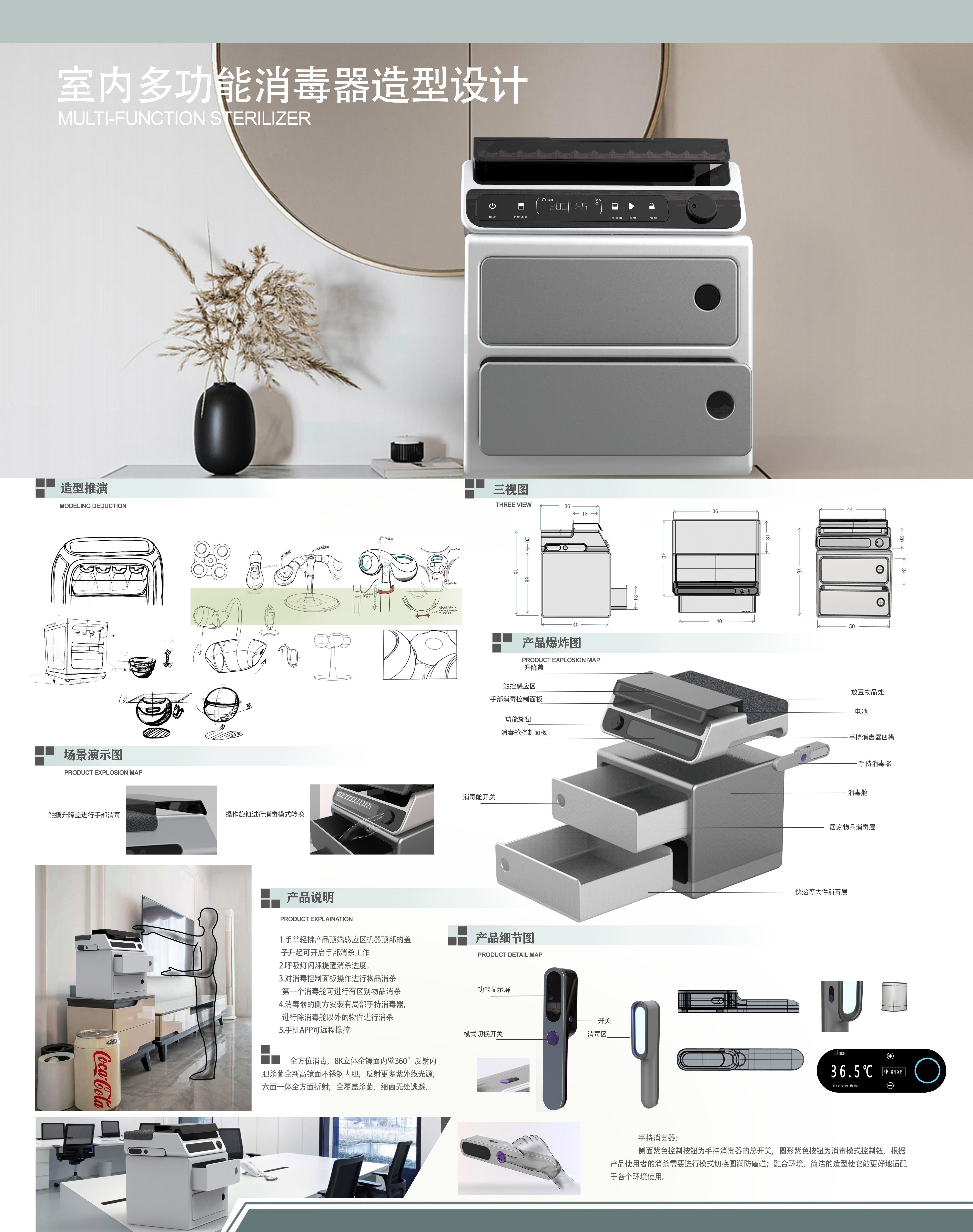 全球范围内对健康和疾病预防的关注度提高。室内多功能消毒器设计提供有效的消毒和杀菌功能,减少细菌病毒存在保障人们健康。操作中存在消毒方式不科学、消毒器具使用不合理情况。对于不同物件需不同的消毒强度,仅通过普通酒精消杀显然不合适。针对于此类现象,结合社会实际与现有技术支持进行多功能消毒器造型设计,该产品功能包括手部消毒、随身物品消毒、快递等大物件消毒;辅助:手持消毒器(不限产品使用场地,方便消杀)。