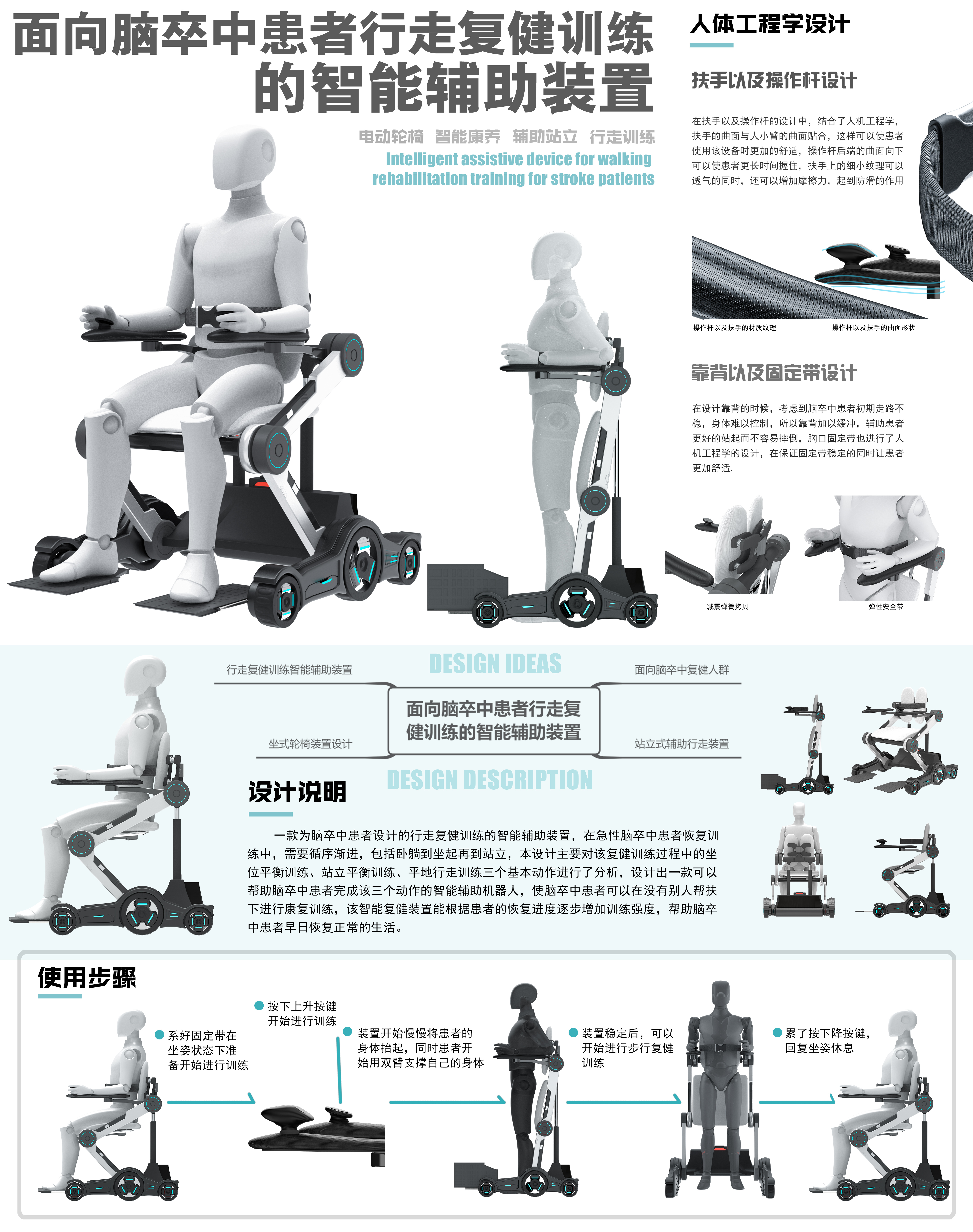 一款为脑卒中患者设计的行走复健训练的智能辅助装置,在急性脑卒中患者恢复训练中,需要循序渐进,包括卧躺到坐起再到站立,本设计主要对该复健训练过程中的坐位平衡训练、站立平衡训练、平地行走训练三个基本动作进行了分析,设计出一款可以帮助脑卒中患者完成该三个动作的智能辅助机器人,使脑卒中患者可以在没有别人帮扶下进行康复训练,该智能复健装置能根据患者的恢复进度逐步增加训练强度,帮助脑卒中患者恢复正常生活。