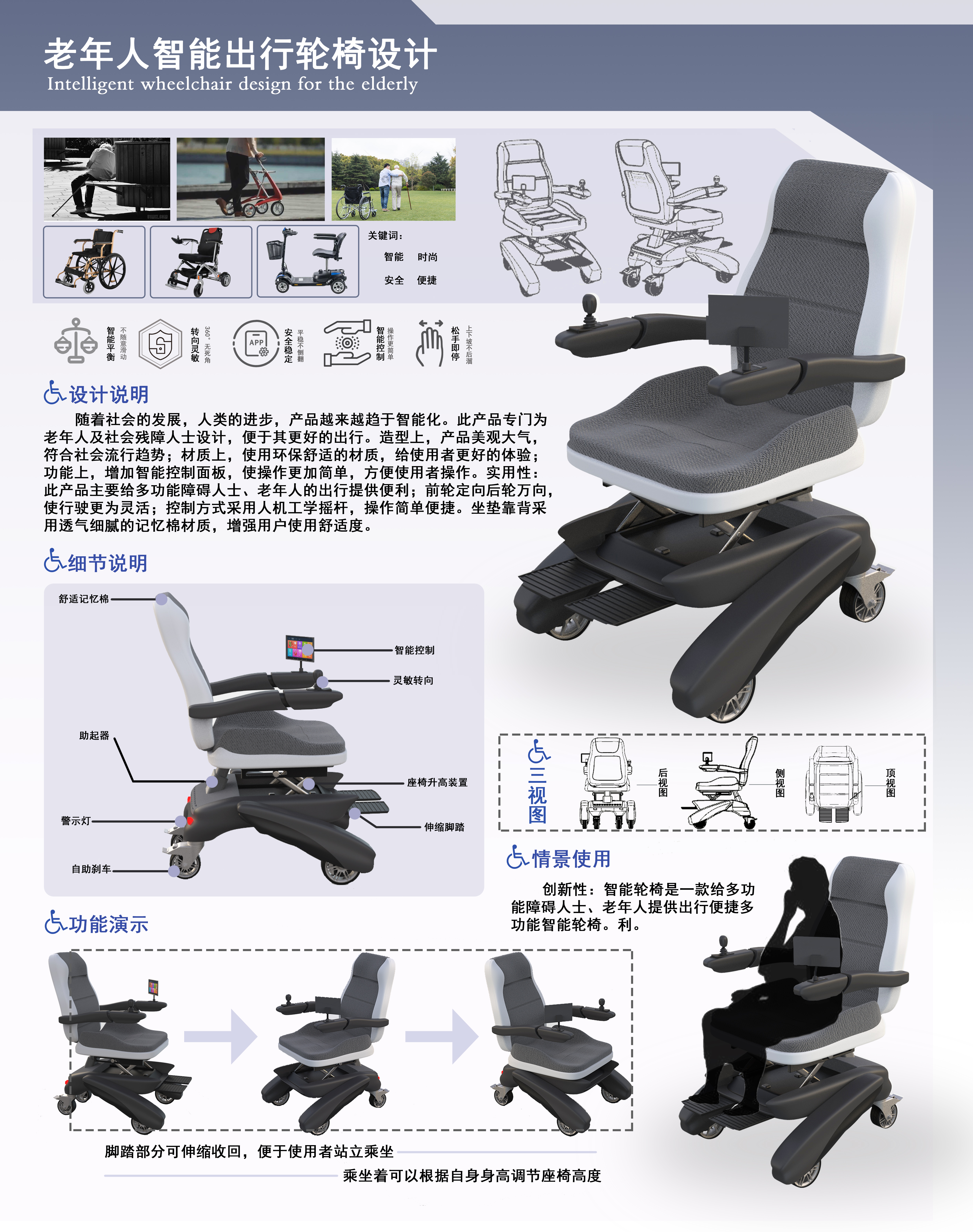 产品专门为老年人及社会残障人士设计,便于其更好的出行。造型上,产品美观大气,符合社会流行趋势;材质上,使用环保舒适的材质,给使用者更好的体验; 功能上,增加智能控制面板,使操作更加简单,方便使用者操作。实用性:此产品主要给多功能障碍人士、老年人的出行提供便利;前轮定向后轮万向,使行驶更为灵活;控制方式采用人机工学摇杆,操作简单便捷。坐垫靠背采用透气细腻的记忆棉材质,增强用户使用舒适度。