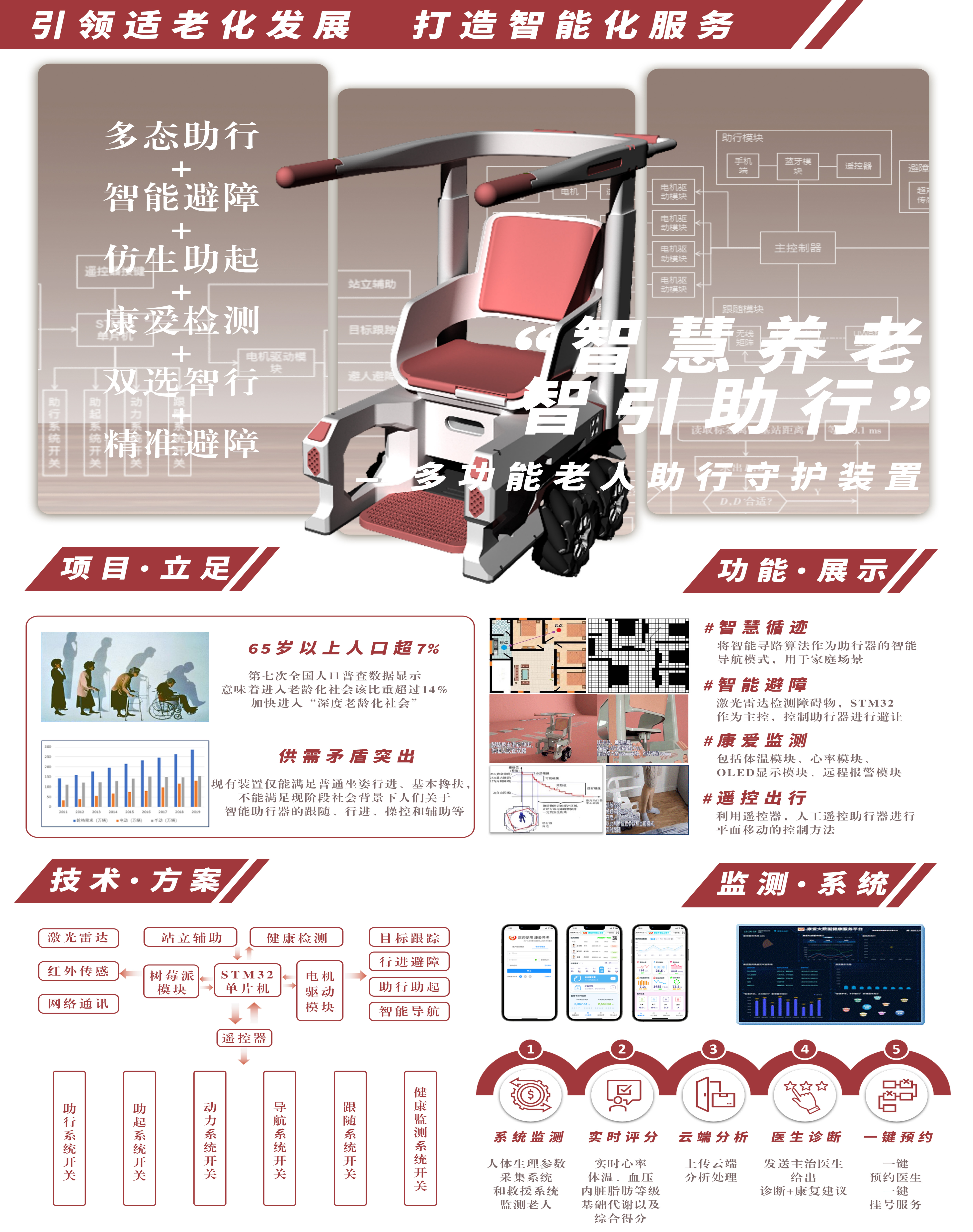 团队研发的智能老人助行装置,旨在解决老人出行问题,帮助残障人士出行。设计目的是为了提高老年人和残障人士的生活质量,让他们更加自主地进行日常活动,同时也为病人提供更好的疗养环境。该装置具有多种功能,包括多态助行、智慧循迹、仿生助起、康爱检测、双选智行和精准避障等,可以满足不同人群的需求。意义在于,它可以帮助老年人和残障人士更好地融入社会,提高他们的生活质量和幸福感,同时也为病人提供更好的疗养环境。