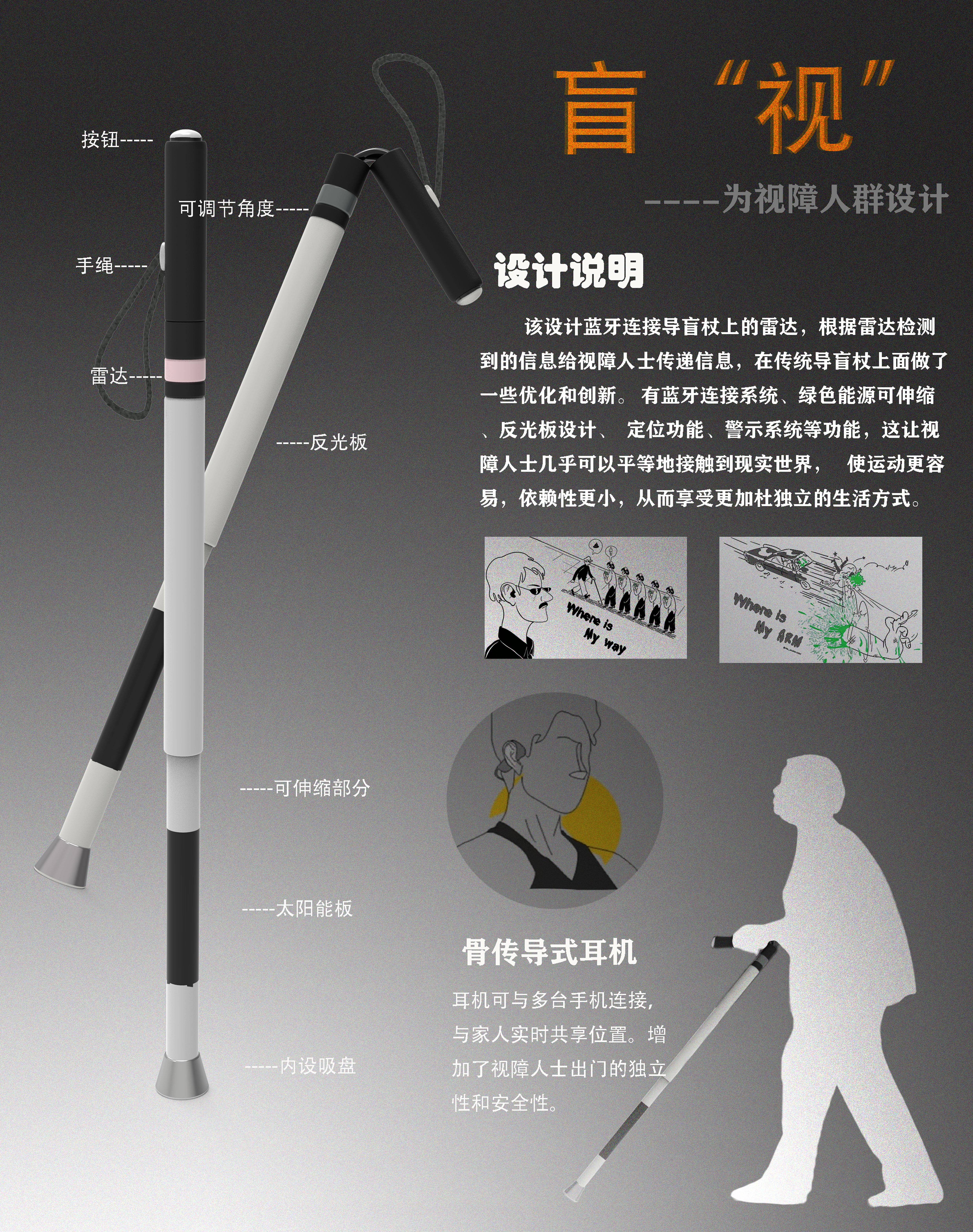 该设计蓝牙连接导盲杖上的雷达,根据雷达检测到的信息给视障人士传递信息,在传统导盲杖上面做了一些优化和创新。有蓝牙连接系统、绿色能源可伸缩、反光板设计、 定位功能、警示系统等功能,这让视障人士几乎可以平等地接触到现实世界,使运动更容易,依赖性更小,从而享受更加杜独立的生活方式。