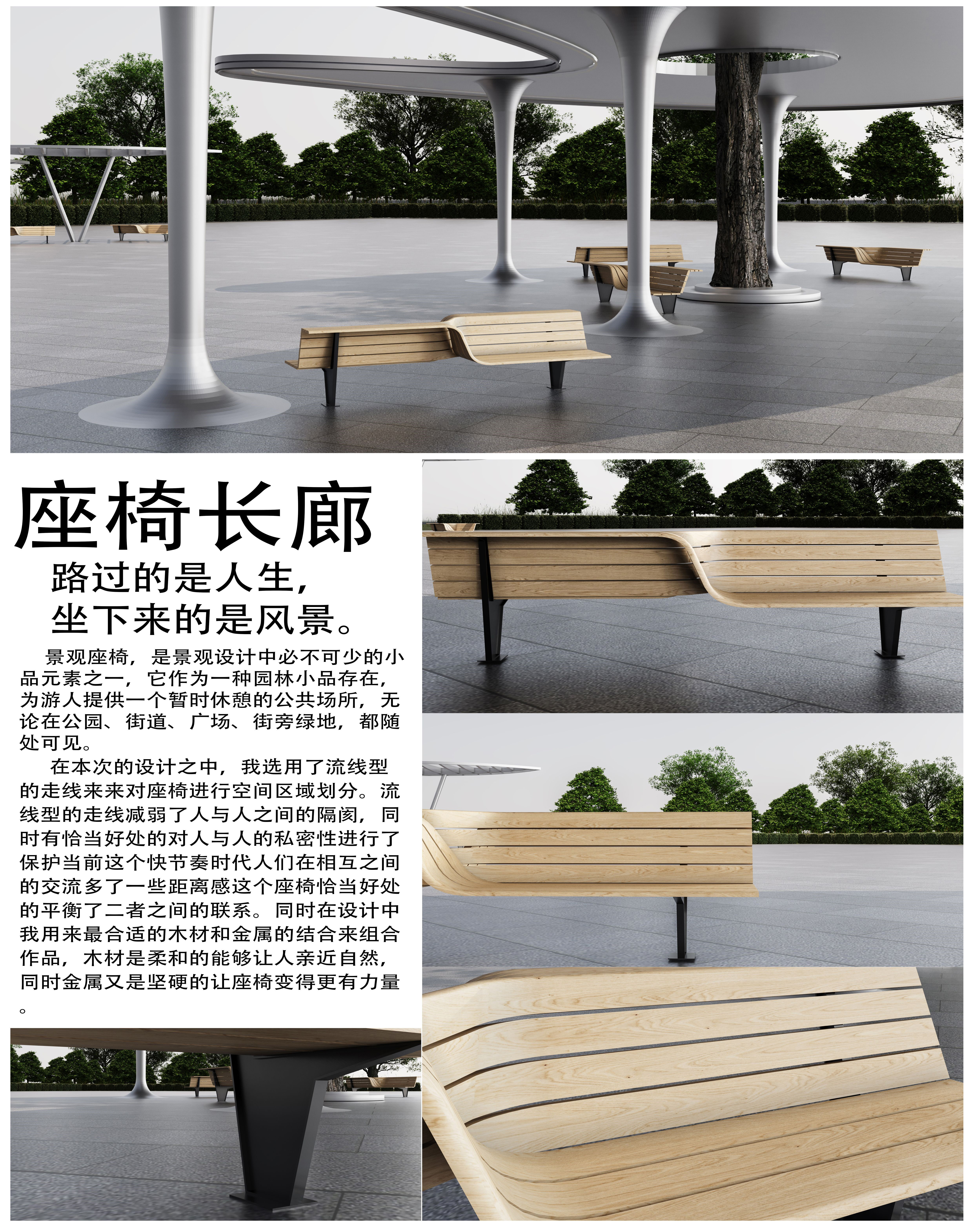 在本次的设计之中,我选用了流线型的走线来对座椅进行空问区域划分。流线型的走线减弱了人与人之间的隔阁,同时有恰当好处的对人与人的私密性进行了保护。当前这个快节奏时代人们在相互之间的交流多了一些距离感,这个座椅恰当好处的平衡了二者之间的联系。同时在设计中我用了最合适的木材和金属的结合来组合作品,木材是柔和的能够让人亲近自然,同时金属又是坚硬的让座椅变得更有力量。