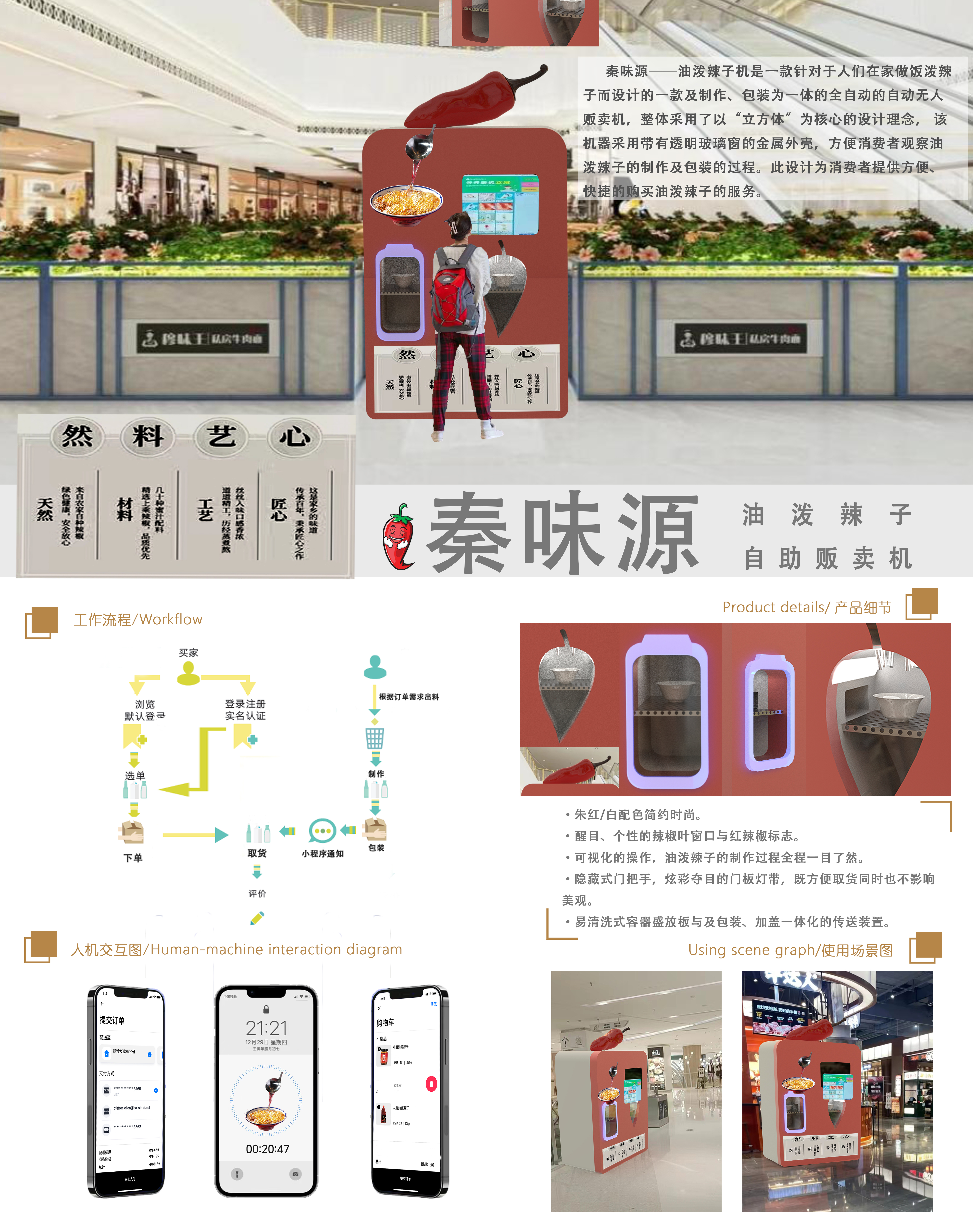 秦味源——油泼辣子机是一款针对于人们在家做饭泼辣子而设计的一款及制作、包装为一体的全自动的自动无人贩卖机,整体采用了以“立方体”为核心的设计理念, 该机器采用带有透明玻璃窗的金属外壳,方便消费者观察油泼辣子的制作及包装的过程。此设计为消费者提供方便、快捷的购买油泼辣子的服务。