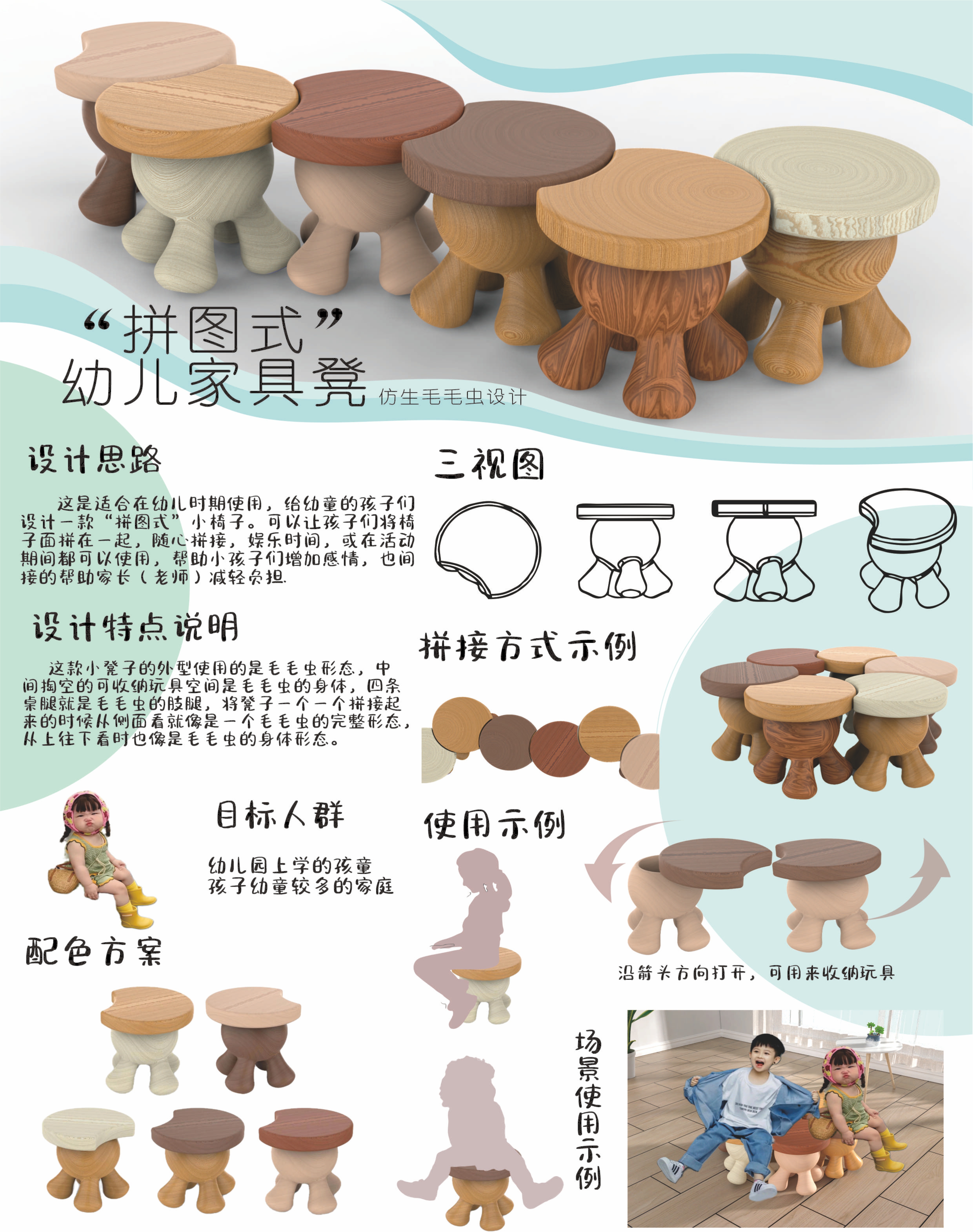 这是适合在幼儿时期使用,给幼童的孩子们设计一款“拼图式”小椅子。可以让孩子们将枯子面拼在一起,随心拼接,娱乐时间,或在活动期间都可以使用,帮助小孩子们增加感情,也间接的帮助家长(老师)减轻担 这款小凳子的外型使用的是毛毛虫形态,中间掏空的可收纳玩具空间是毛毛虫的身体,四条桌腿就是毛毛虫的肢腿,将凳子一个一个拼接起来的时候从侧面看就像是一个毛毛虫的完整形态从上往下看时也像是毛毛虫的身体形态。
