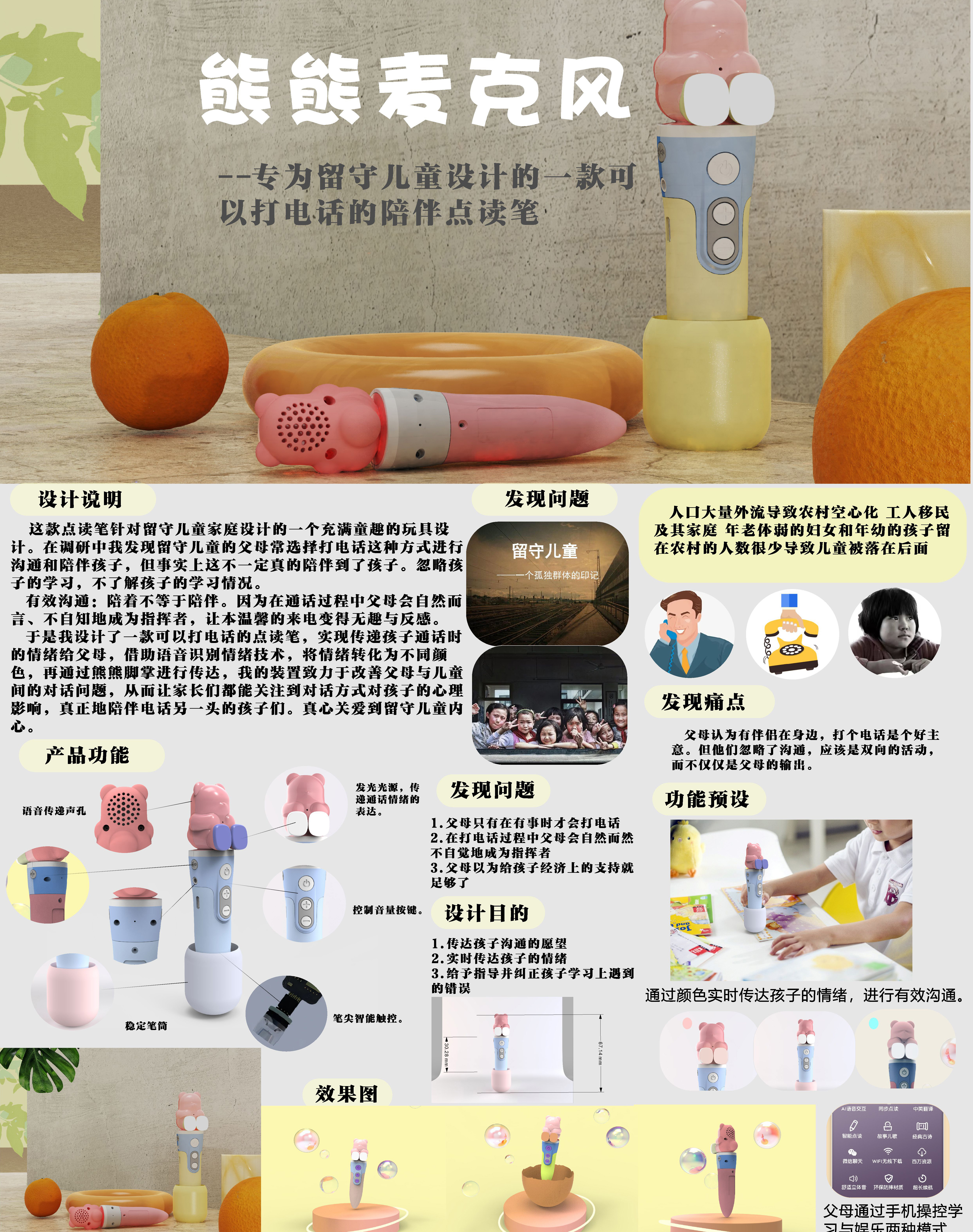 这款点读笔针对留守儿童家庭设计的一个充满童趣的玩具设计。在调研中我发现留守儿童的父母常选择打电话这种方式进行沟通和陪伴孩子,但事实上这不一定真的陪伴到孩子。于是我设计了一款可以打电话的点读笔,实现传递孩子通话时的情绪给父母,借助语音识别情绪技术,将情绪转化为不同颜色,从而让家长们都能关注到对话方式对孩子的心理影响,真正地陪伴电话另一头的孩子们。真心关爱到留守儿童内心。