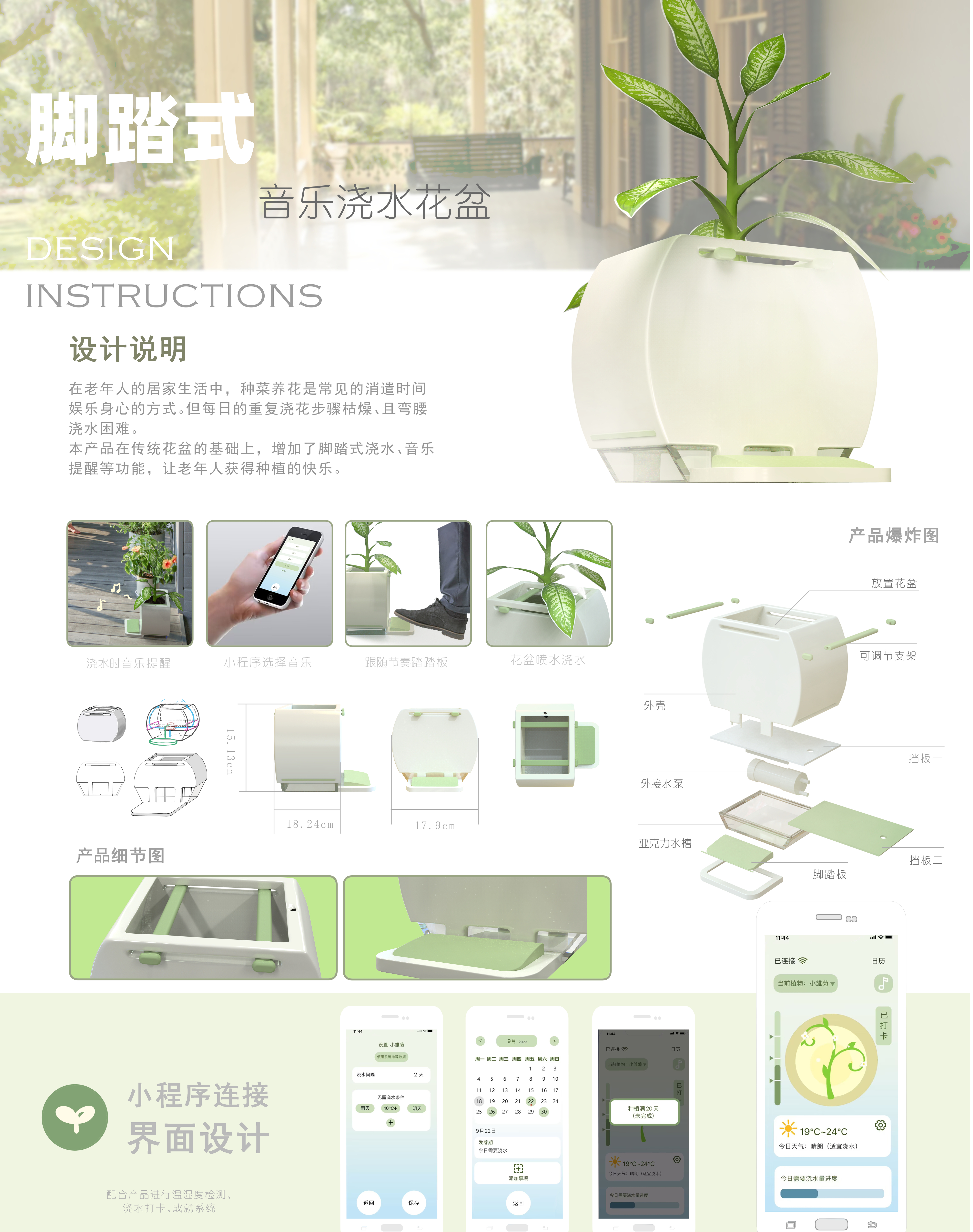 在老年人的居家生活中,种菜养花是常见的消遣时间娱乐身心的方式。但每日的重复浇花步骤枯燥、且弯腰浇水困难让很多老年人不得不放弃了这一爱好。 本产品在传统花盆的基础上,增加了脚踏式浇水、音乐提醒等功能,让中老年人能够轻松重拾种植的快乐。