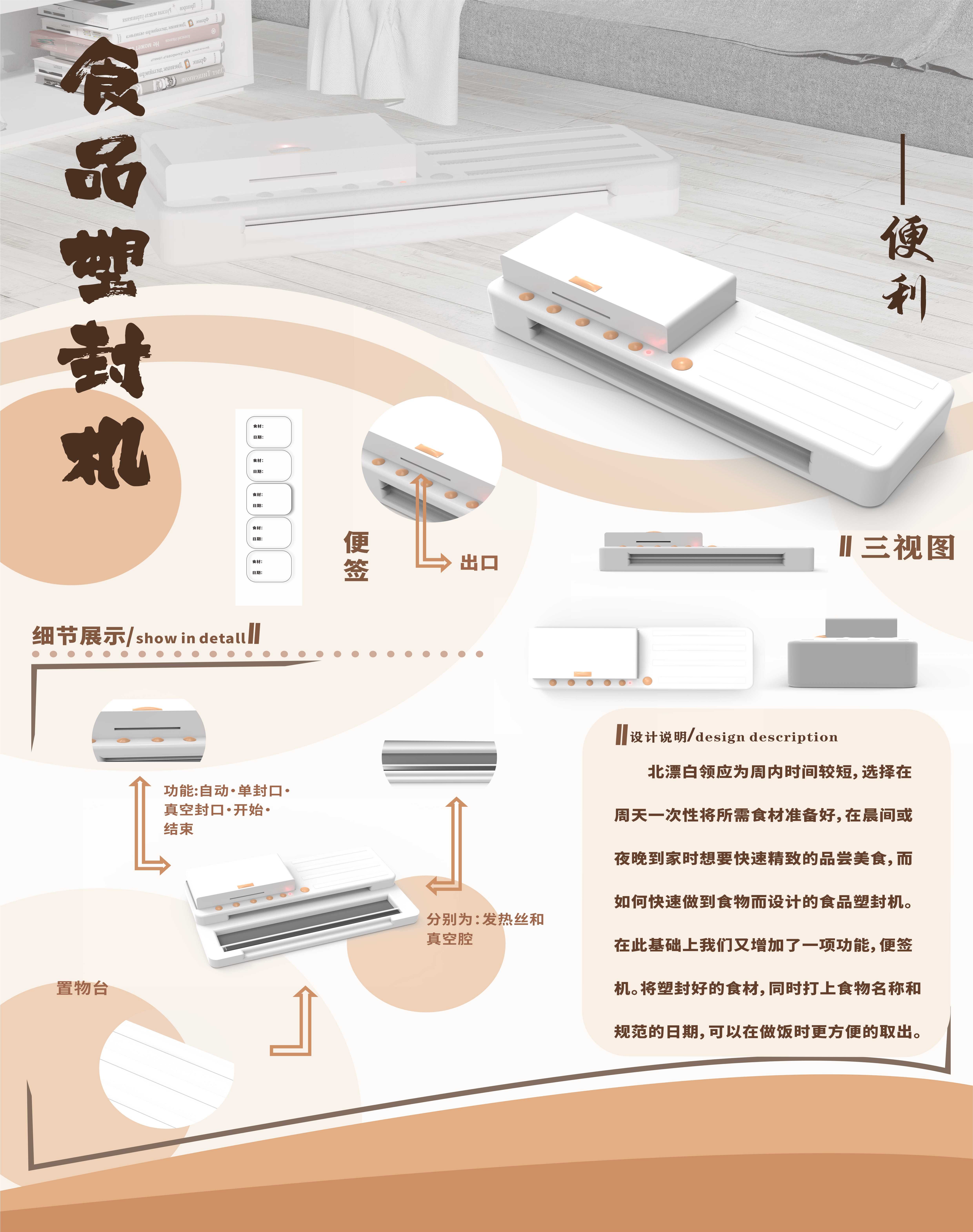 北漂白领应为周内时间较短,选择在周天一次性将所需食材准备好,在晨间或夜晚到家时想要快速精致的品尝美食,而 如何快速做到食物而设计的食品塑封机。在此基础上我们又增加了一项功能,便签机。将塑封好的食材,同时打上食物名称和 规范的日期,可以在做饭时更方便的取出