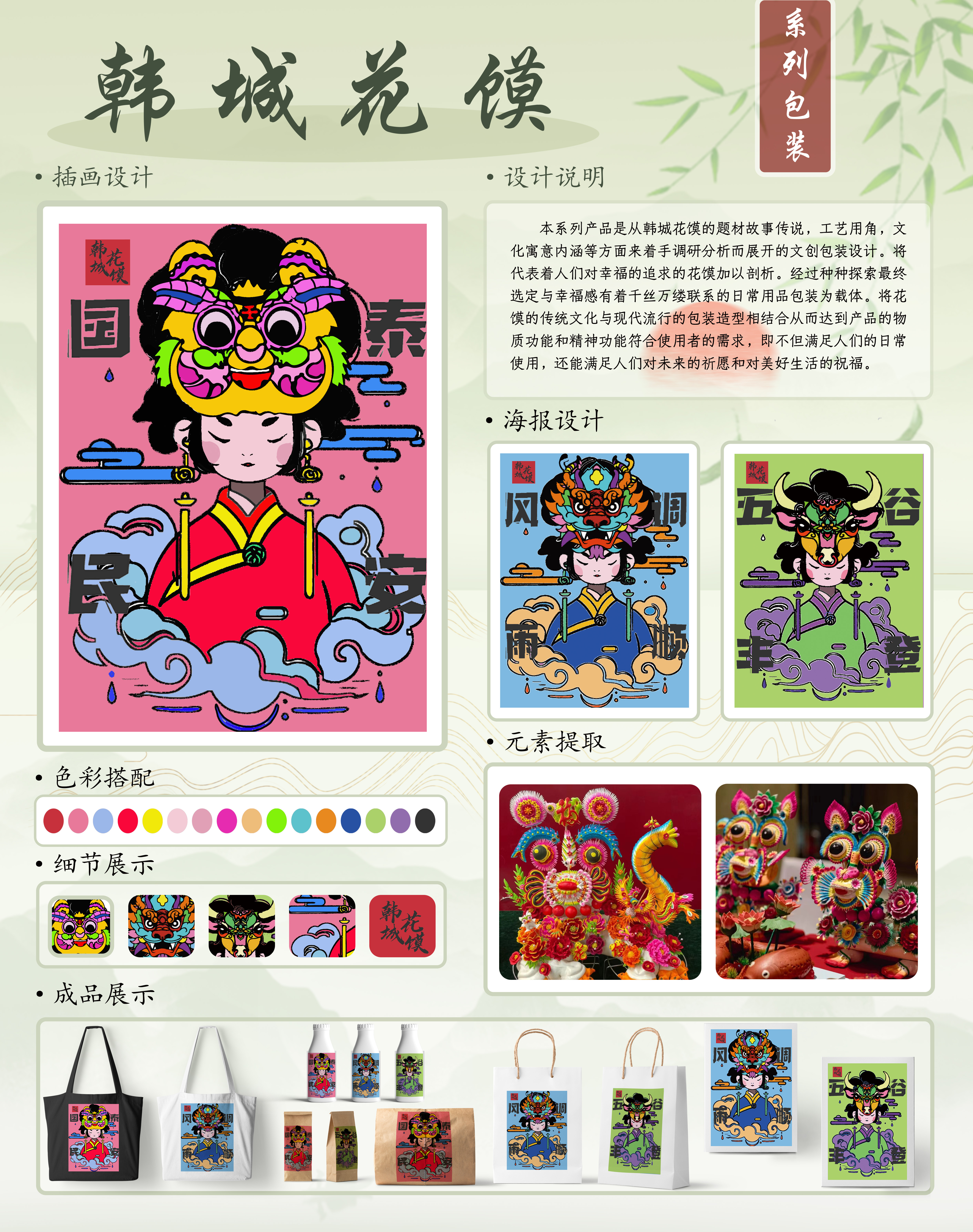 本系列产品是从韩城花馍的题材故事传说,工艺用角,文化寓意内涵等方面来着手调研分析而展开的文创包装设计。将代表着人们对幸福的追求的花馍加以剖析。经过种种探索最终选定与幸福感有着千丝万缕联系的日常用品包装为载体。将花馍的传统文化与现代流行的包装造型相结合从而达到产品的物质功能和精神功能符合使用者的需求,即不但满足人们的日常使用,还能满足人们对未来的祈愿和对美好生活的祝福。